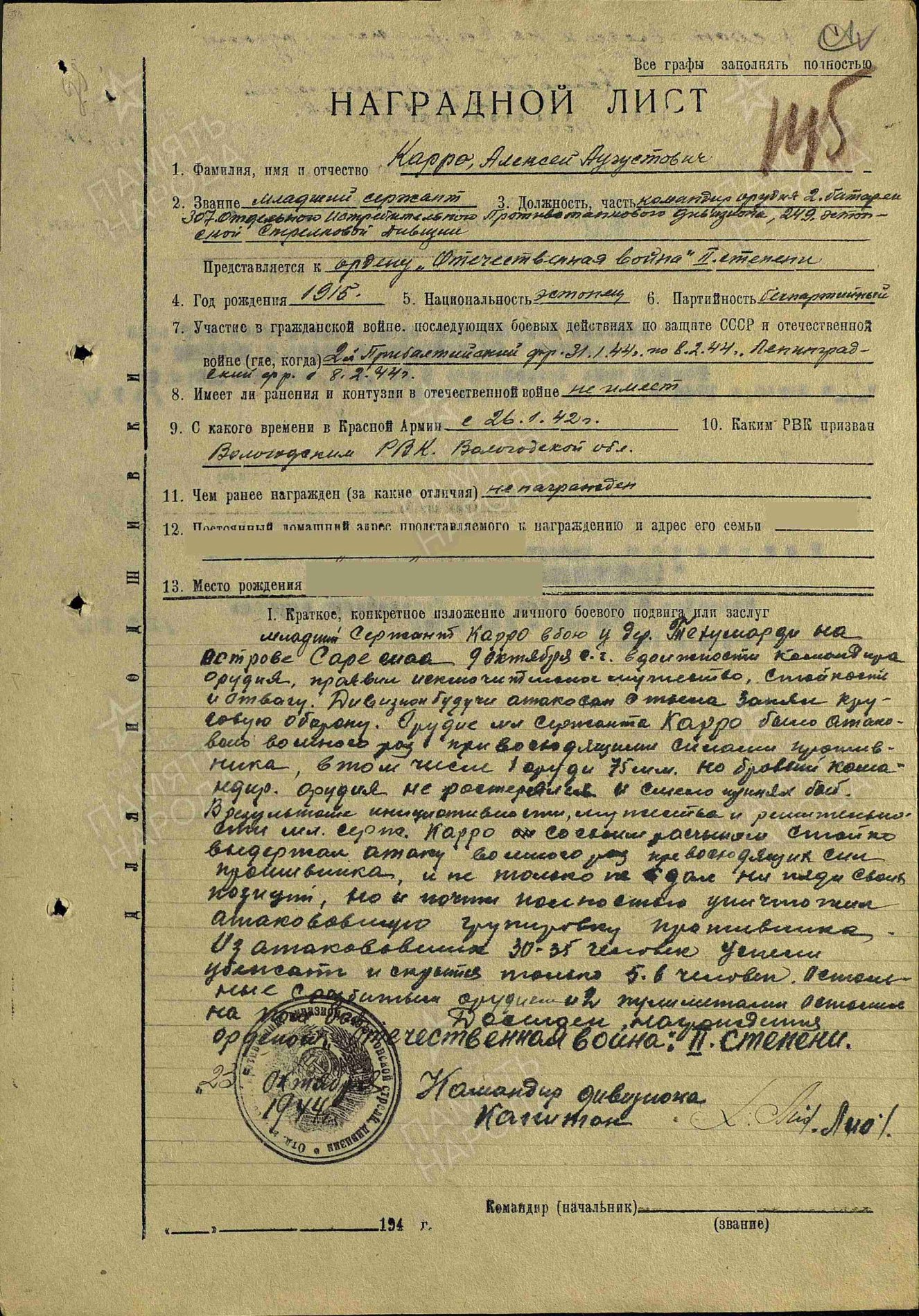 Nooremseersant Aleksei Karro, 249. Eesti Laskurdiviis, 307. Üksiku tankitõrjedivisjoni 2. patarei relvakomandör. Tehumardi lahingu eest saadud Isamaasõja 2. klassi ordeni nr. 268845 kavaler. Karro on saanud veel Punatähe ordeni nr. 1151824 (Emajõe forsseerimine septembris 1944.a) ja Kuulsuse III klassi ordeni nr. 464935 (Kuramaa lahingud).