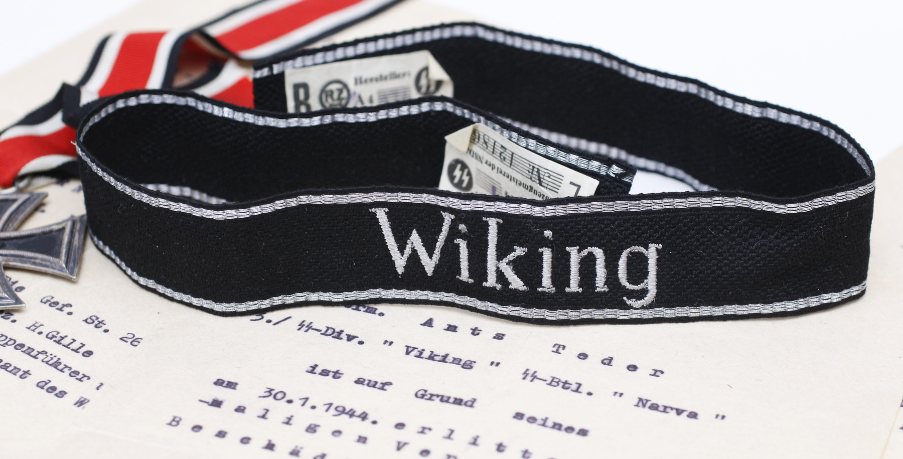 Saaremaa talust , kus EW ajal oli perekonnas tuletõrjuja ja II Maailmasöjas saksa söjaväelane . Kui googeldada fraasiga "original waffen SS cuff titles " siis leiab sarnaseid küll . Mida arvata ?