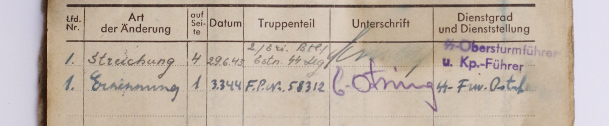 Huvitav sissekanne on tema SB kolmandal leheküljel, kuhu kantakse sisse ja kinnitatakse ülema poolt palgaraamatu 1. ja 2. leheküljel tehtud muudatused. Seal on 03.03.1944 kuupäevaga sissekanne, et 1. leheküljel on auastet muudetud ja selle muudatuse on kinnitatud 46. rügemendi pioneerkompanii ülem Ostuf. Elmar Otsing. Huvitav (minu jaoks) on aga see, et tavaliselt märgiti auastmeülendused sõnaga Beförderung aga siin on Ernennung - esimene tähendab ülendamist ja teine nimetamist. See nimetamine on toimunud keset kõige ägedamaid sillapeade likvideerimise lahinguid ja mulle tundub sellisel ajal Sturmmann'iks nimetamine / ametikohustuste andmine näiteks kui väljalangenud jaoülema asemele uue tekitamine või lahingus eriliselt silmapaistnud sõduri tunnustamine sellega, et sai kohapeal kohe ülenduse. Hiljem vajas selline asi ilmselt siiski kinnitust päris ülendamisena (Beförderung).