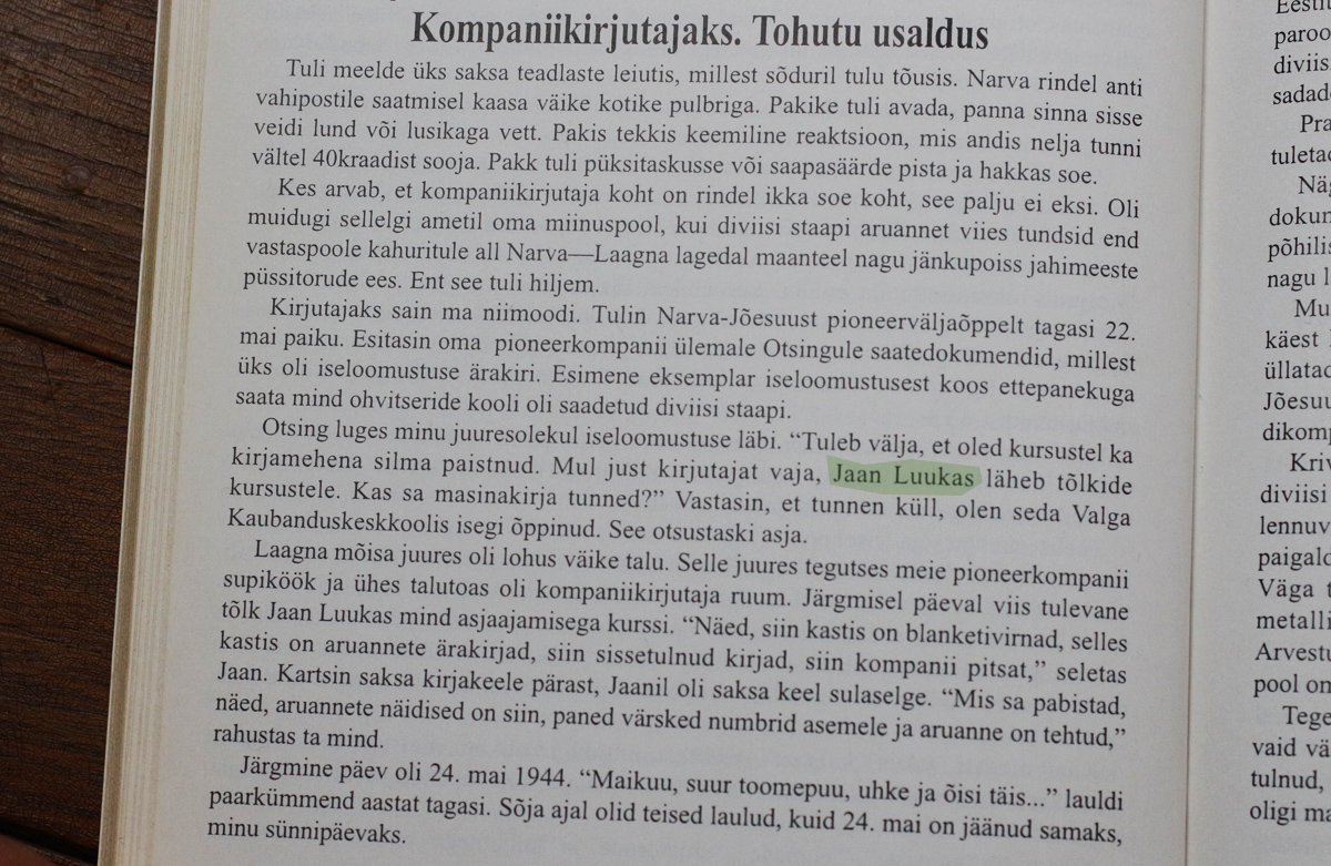 Viimati postitatud SB omanik Jaan Luukas jookseb läbi ka temaga ühes kompaniis teeninud Kalju Roolaine mälestusteraamatust "Skaudipoisina elu miiniväljadel". Roolaine meenutab, et asus kompaniikirjutaja kohale ja vahetas sellelt kohalt välja Luukase, kes pidi minema tõlkide kursustele. Tegelikult käis ta kursustel / tõlkide koolis täpselt aasta varem - 1943. aasta mais.