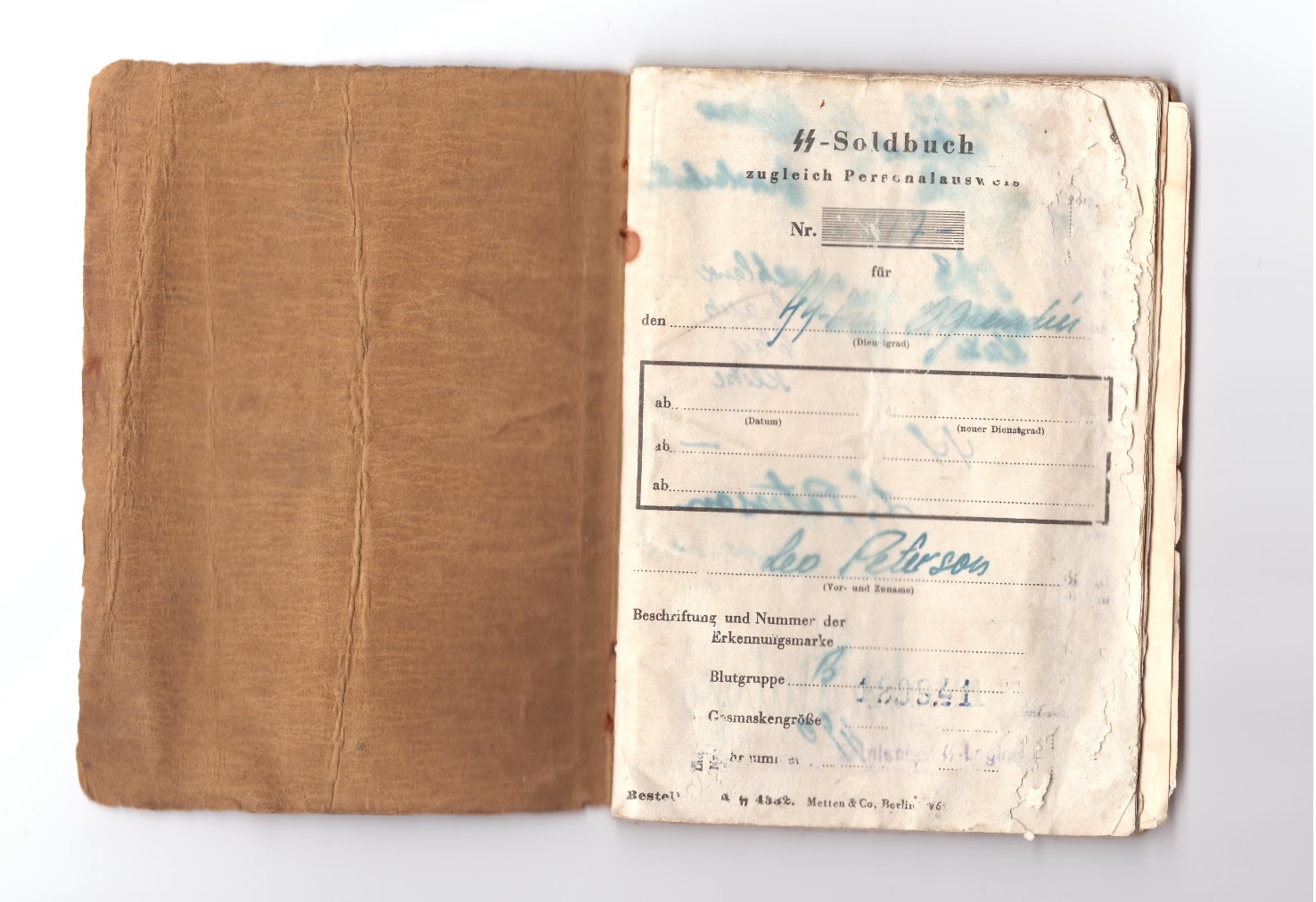 SS-Frw.O.Grenadier Leo Peterson´i Soldbuch. Klooga Soldbuchile omaselt on sissekandeid hõredalt. Küll aga leiab varustuslehelt huvitava märke, et talle on kätte jagatud Tarnjacke.