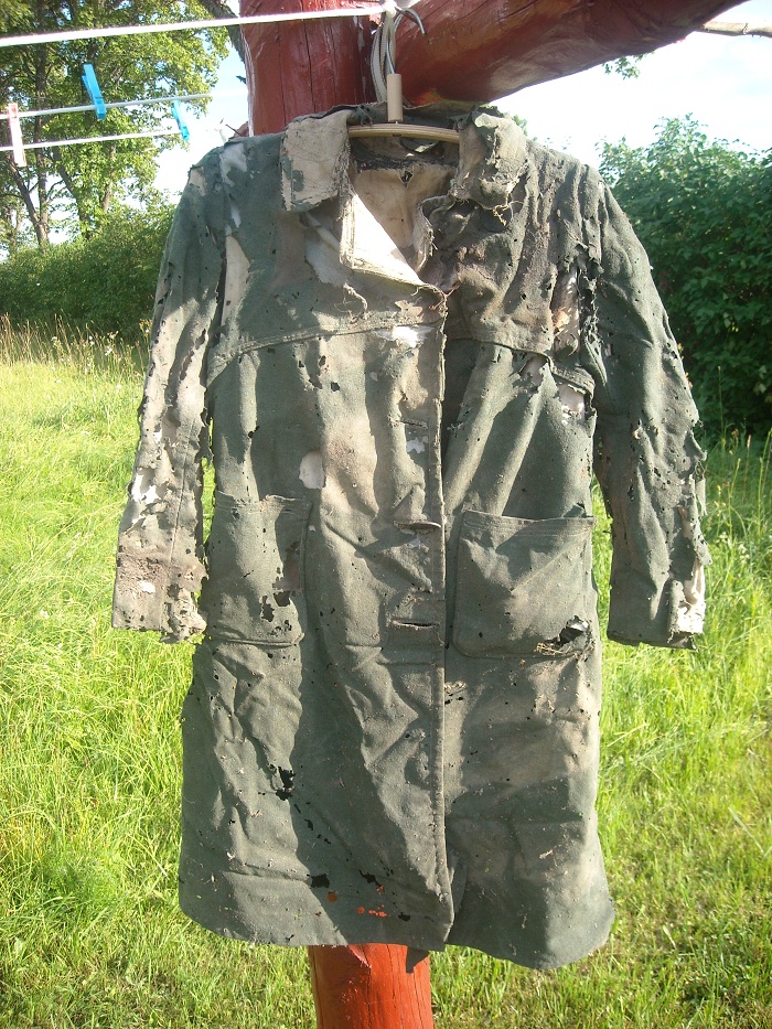 Feldgrau lastemantel. Unustasin jäädvustada, kuid see on omamoodi äge, et parajatesse mõõtmetesse ajamiseks on seljaosa keskel riie kokku õmmeldud- lahti harutades on täismõõtmes asi. Aga noh, rohekashall on teadupärast kõige maitsvam värv ning teha pole temaga seetõttu midagi.