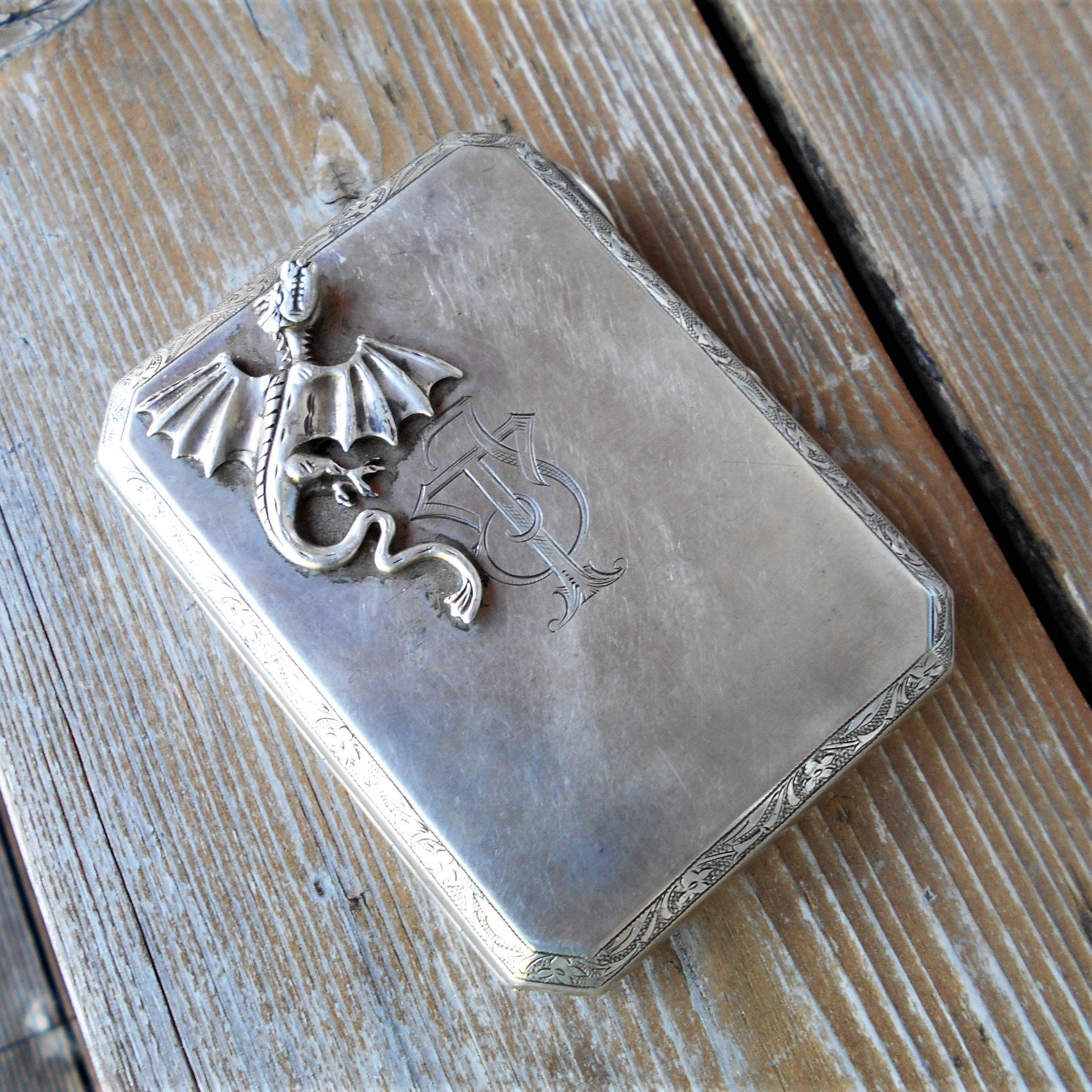 Kas tegu võiks olla Auto-tanki rügemendi või Kaitseliidu Tallinna Maleva Üksik soomusautorühma liikmele tehtud kingitusega?Sees graveering Jaan Tummale 40 a. sünnipäevaks.Draakoni kujutamine meie kultuuriruumis väga tavapärane pole,sellest ka küsimus.