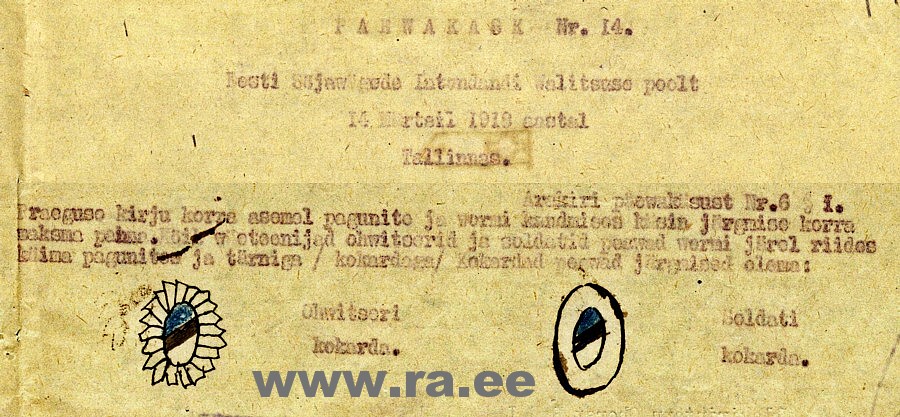 Päewakäsk on arusaadav, eks segadust tekitas see, et VS ajal tuli ovaalne mütsimärk kasutusele 1919 märtsis ja ma ei oodanud sellist mütsimärki näha nii varajasel pildil. Nüüd olen targem. Ilmselt siiski neid mütsimärke palju ei jõutud kasutusele võtta? Ja kes neid valmistas?