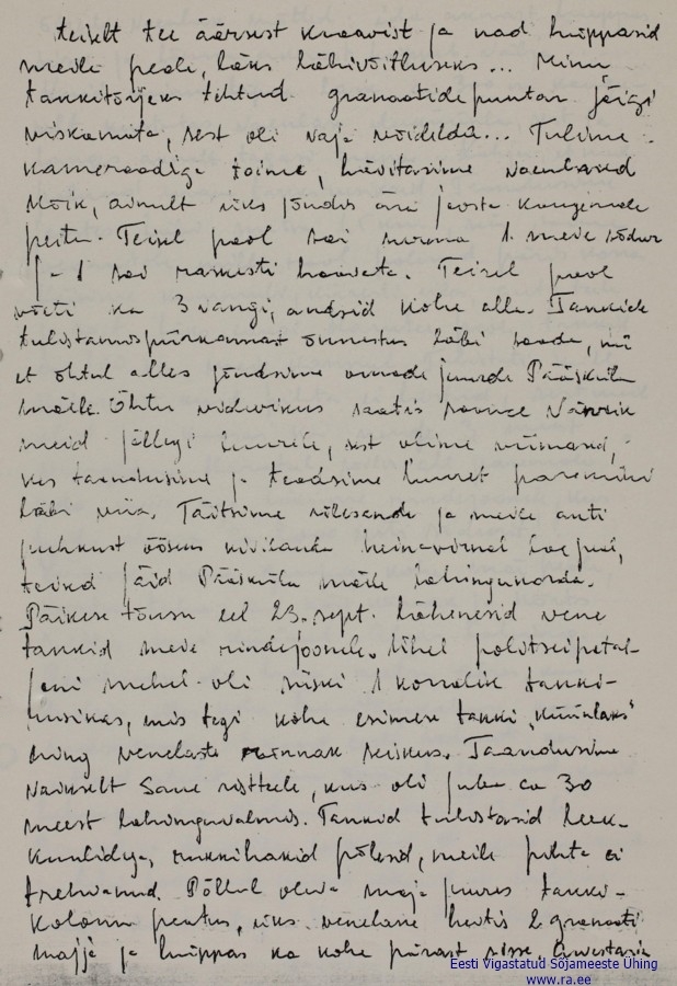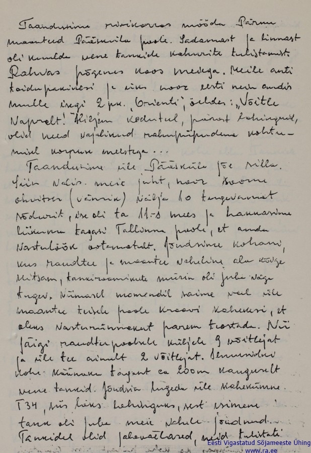 Äärmiselt huvitav lugemine kuivõrd osa sellest olen kuulnud oma vanaonu suust kes oli Ausb.u.Ers.Btl.33 mees ja osales tõenäoliselt ka nendes sündmustes. Kuid tema jõudis kuskile Pärnu-Jaagupi kanti välja kus ikkagi vahetas riided tsiviiliks ja pöördus tagasi Tallinna. Jõudis ka tööle asuda oma endisesse töökohta Eesti Võieksport vist oli omal ajal, kus töötas ekspetiitorina ja õige varsti tuldi talle tööjuurde järgi juba püssimeestega. Edasi nagu ikka 58/1