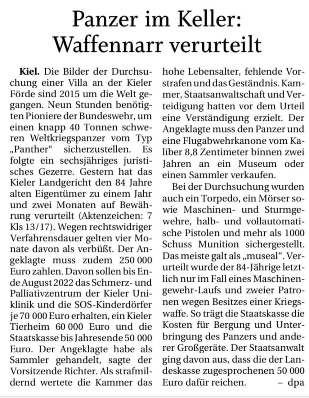 Kes saksa keelt rohkem tönkab võiks tõlkida, ise saan aru et karistuseks sai aasta ja kaks kuud tingimisi ja 250000 trahvi aga seda rohkem leitud kuulipilduja raua ja kahe padruni eest. Tanki ja 8,8se flaki peab kaheks aastaks muuseumile deponeerima või müüma (ilmselt katseajaks siis ? )
