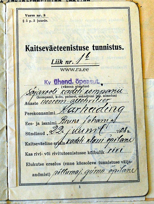 20. juuli 1931. - välja antud kaitseväeteenistuse tunnistus nr. 1093 Kaitsevägede staabi IV osakonnast. Liik nr. 13-c.