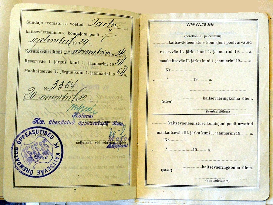 8. jaan. 1930. – Läkitatud K. Ü. Õppeasutiste Sõjakooli aspirantide klassi.