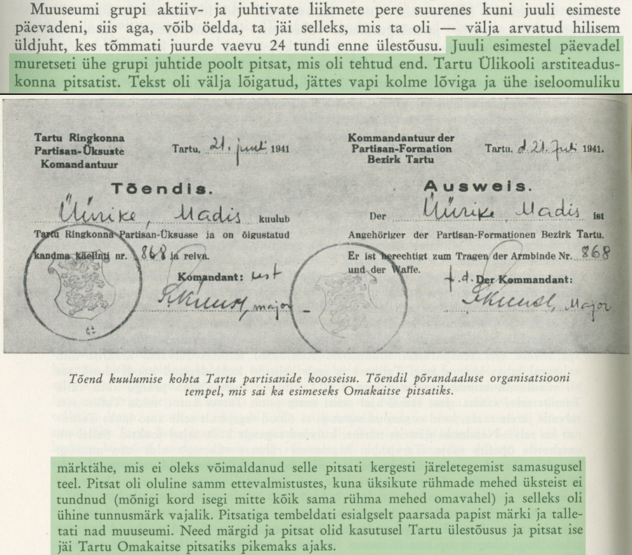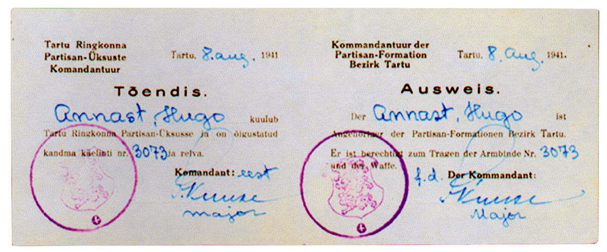 75 aastat tagasi, 1941. aasta juulis lipnik Eugen Sutt'ile välja kirjutatud tõendis selle kohta, et ta kuulub Tartu Ringkonna Partisan-Üksusesse ja on õigustatud kandma üksuse käiselinti.