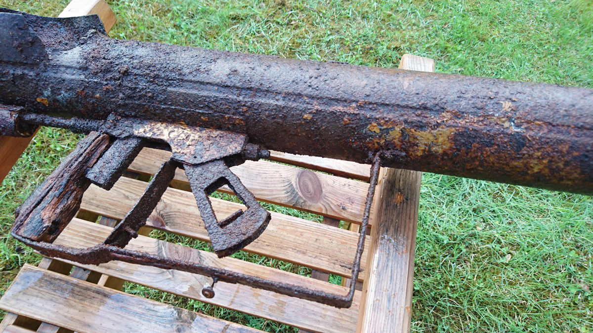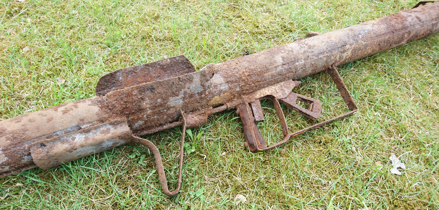 Toru on saanud kuuli- või killutabamuse ja kasutamiskõlbmatuks muutunud relv oli jäetud kaevikuservale maha.