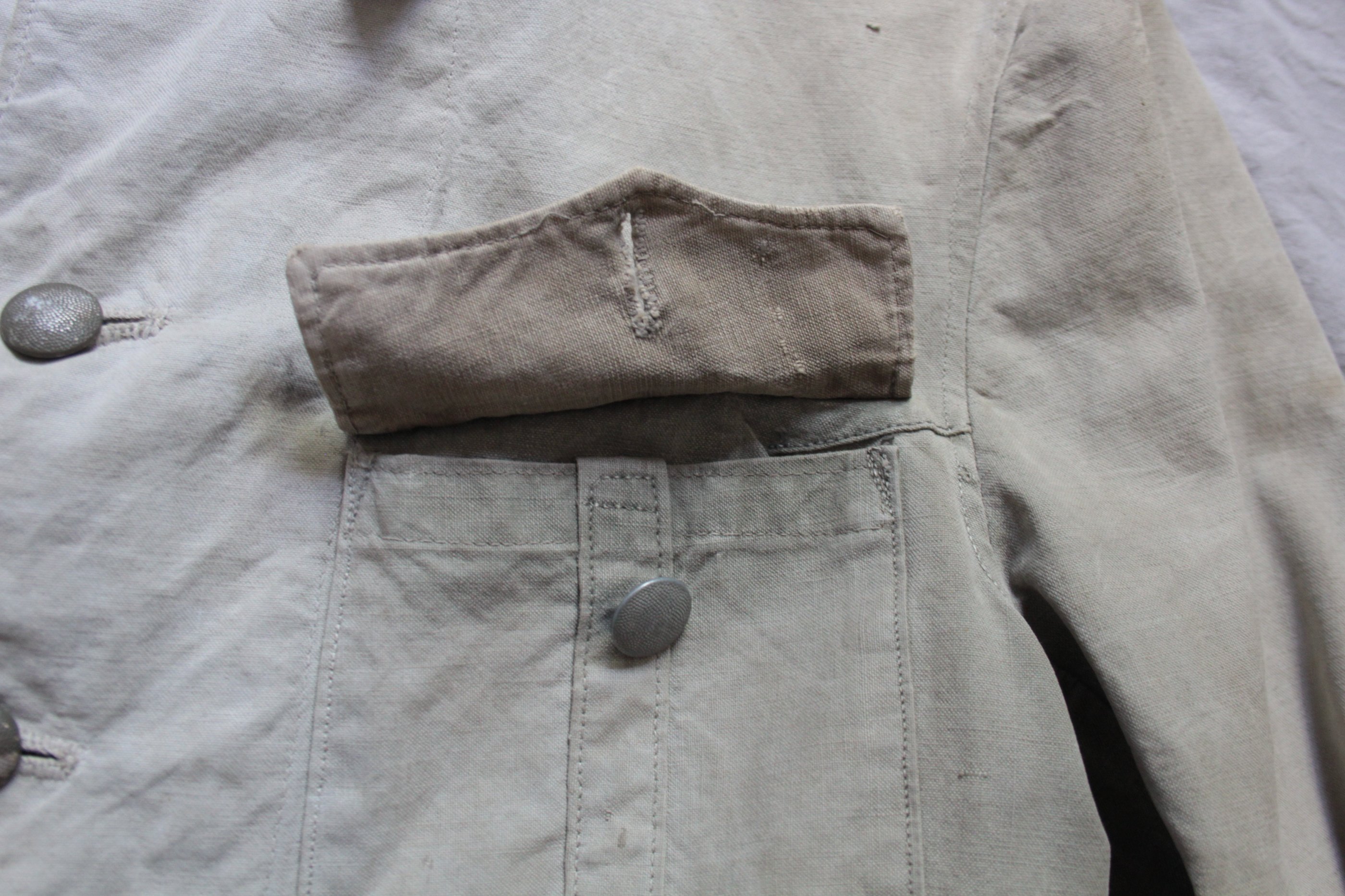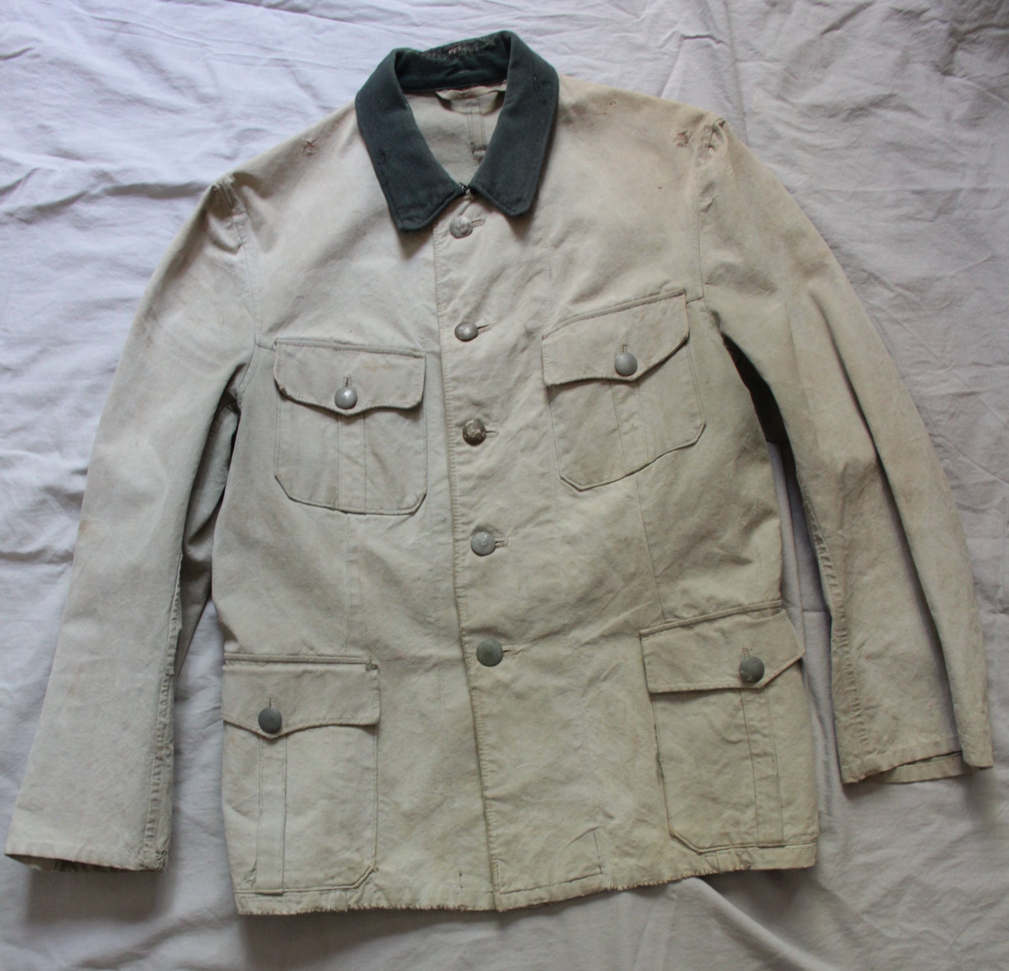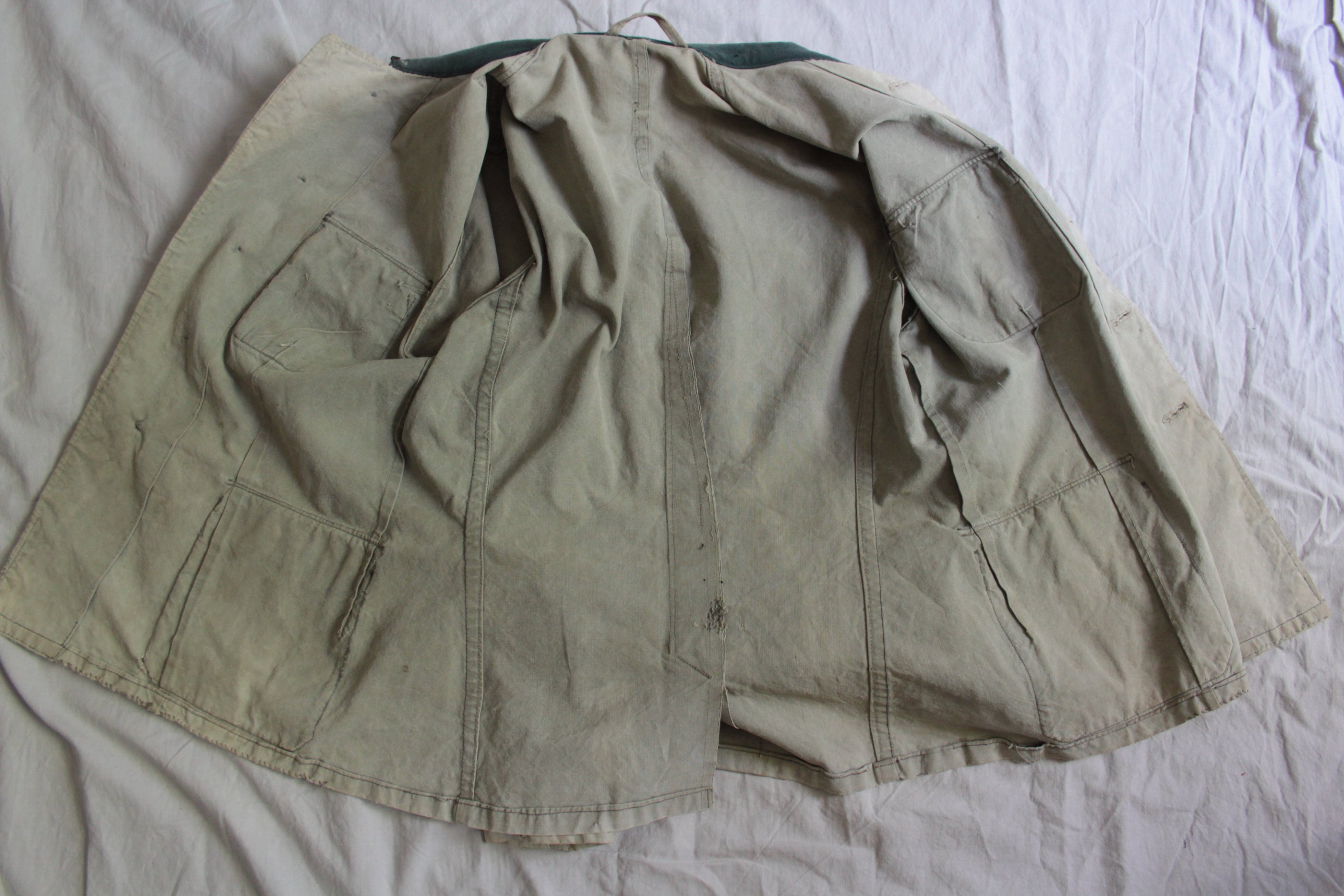 Jakk tehtud vene telkmantlist. Kasutatud kahte eri tooni palatkat. Tüüpiline idarinde rätsepatöö. Originaalis olid ees ainult rinnatasku nööbid.