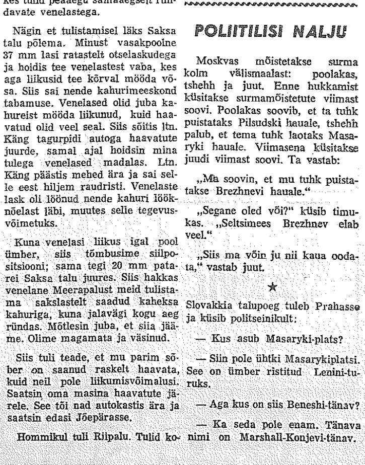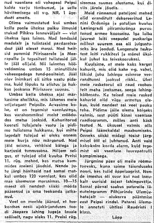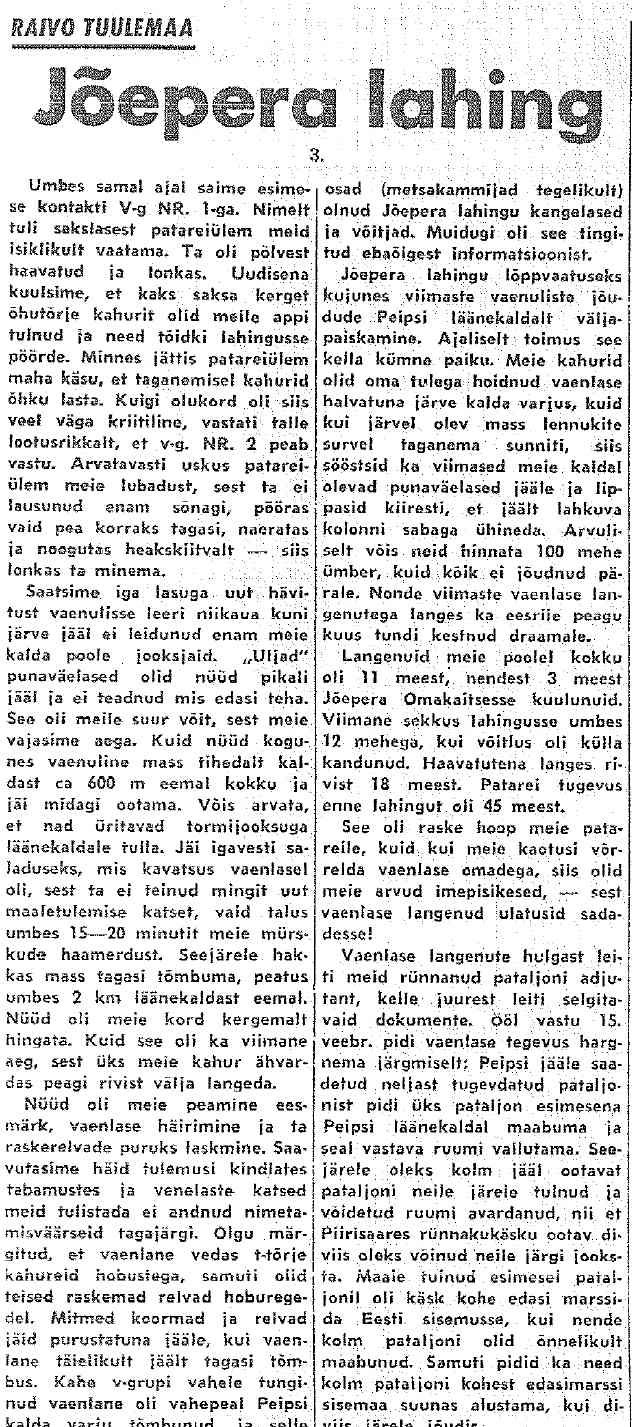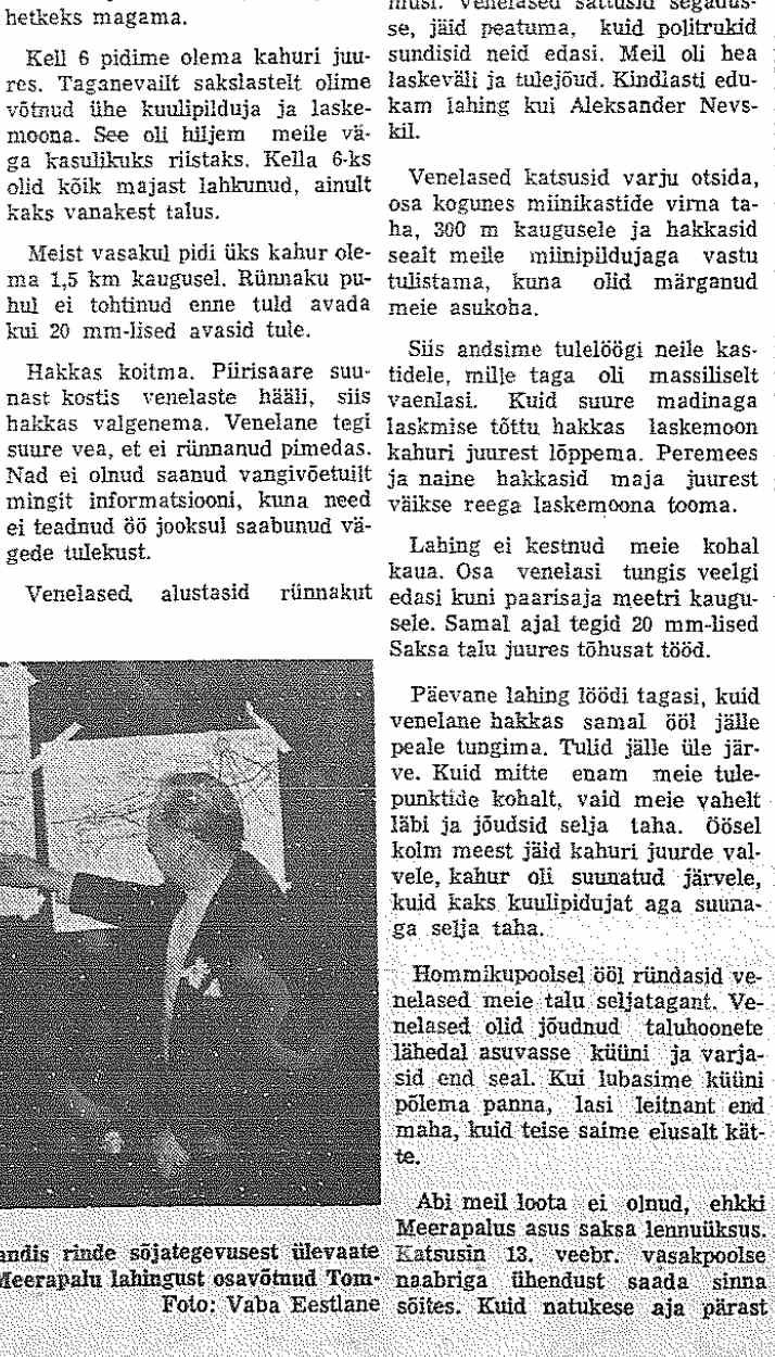 Siis veel keegi Raivo Tuulemaa (võib-olla varjunimi) 1. patareist (Vaba Eestlane. 19., 22. ja 26.02.1958). Ajaliselt distantsilt kõige lähemal ja justkui kõige detailsemad, aga paraku vist ka kõige ilukirjanduslikumad. Jutt uuest pealetungilainest hommikul pole usutav.