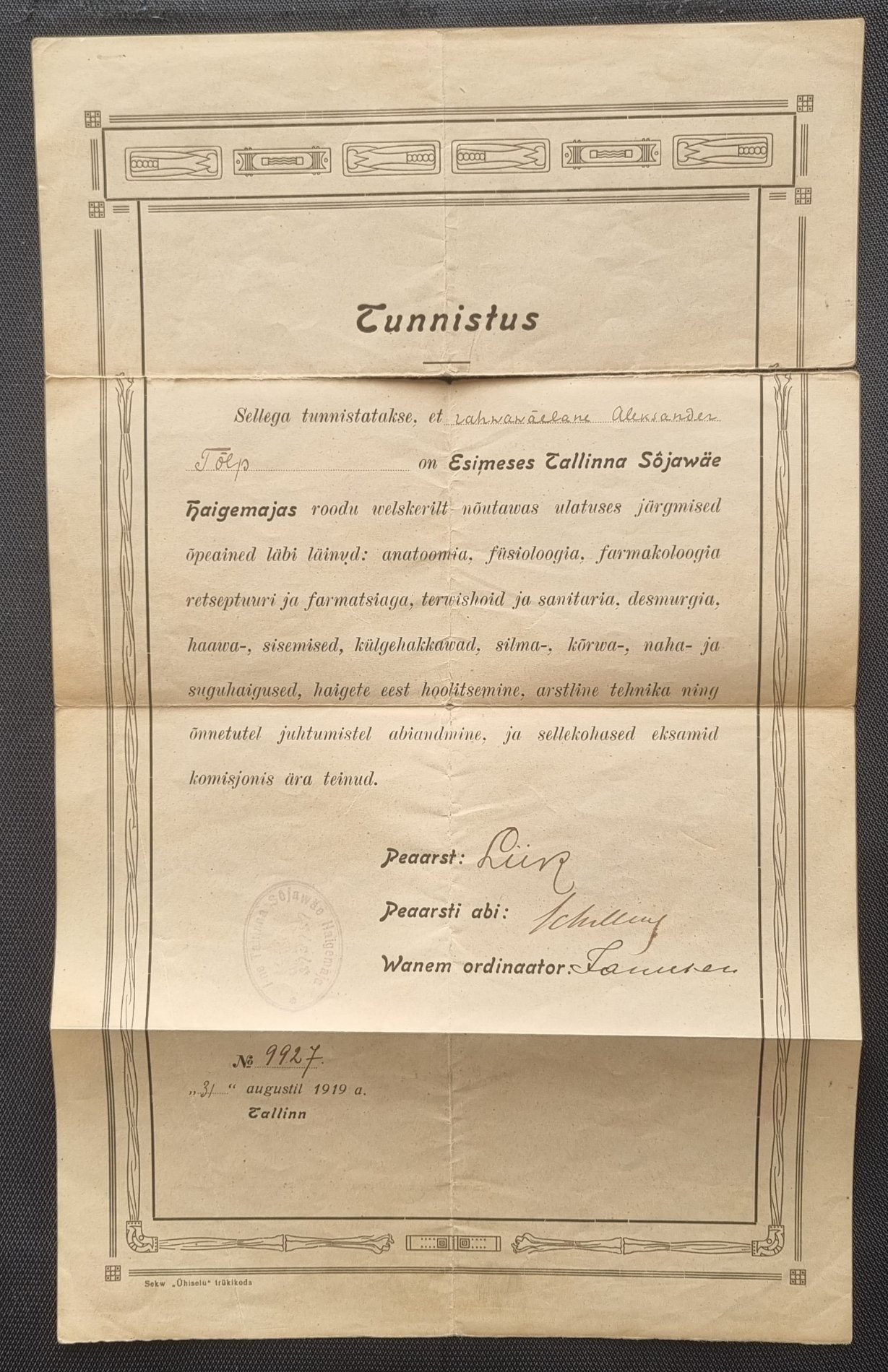 Pärnust sain 2 sellist tunnistust, antud rahvaväelasele Aleksander Tōlpile. Läti medali tunnistus peaks levinud olema aga see sanitari oma on huvitav. Ei tea kas sellisele märk kah juures käis ning kaua selliseid kursuseid tehti?