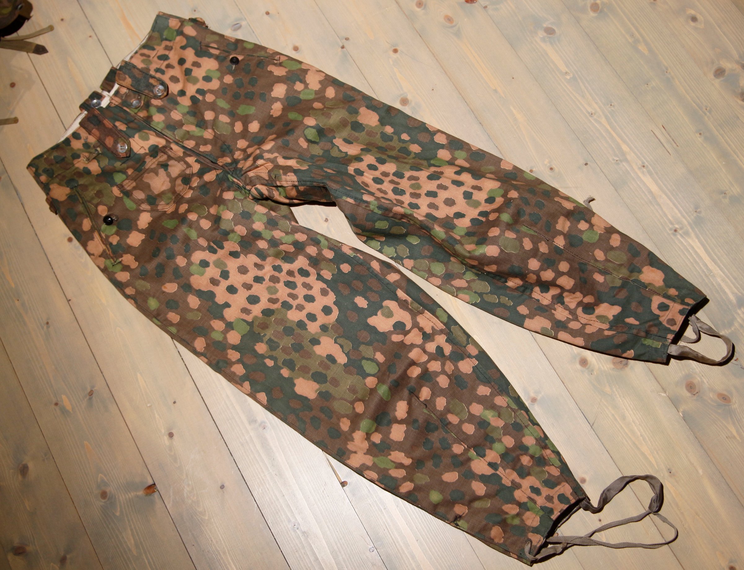 Need HBT kangast püksid (leitud umbes veerandsada aastat tagasi Eestist) on ka tootmisperioodi algusest. Kellatasku on õmmeldud pükste sisse. Paar kuud tagasi ilmus üks mahukas raamat W-SS maskeerimisriietest ja seal näidatud kaheksast sellisest püksipaarist ei olnud ühtegi sellise taskuga. Kui ma peale raamatu ilmumist autoriga suhtlesin siis ta ei olnud sellisest nüansist teadlik. Võimalik, et see esimese otsa partii tuli kõik siia idarindele ja trööbati siin ära. 1944. aasta suvel kui läänerindel lahingud lahti läksid olid selleks ajaks need üksused seal saanud juba hilisema variandi kuued ja püksid. Igatahes kõik püksid, mis ma olen läänes ja sealsetes kollektsioonides näinud on peale õmmeldud taskutega. Siit Eestist on neid sisse õmmeldud taskutega pükse leitud ikka päris mitu paari.