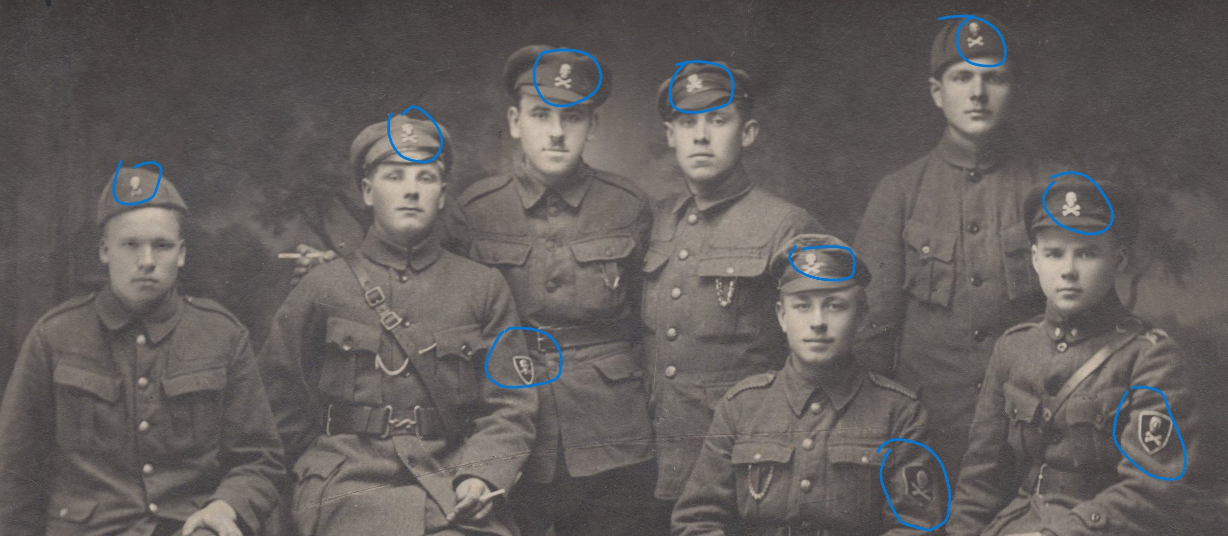 The insignia (skulls) of the battalion are perfectly visible on the sleeves of the soldiers' uniforms.