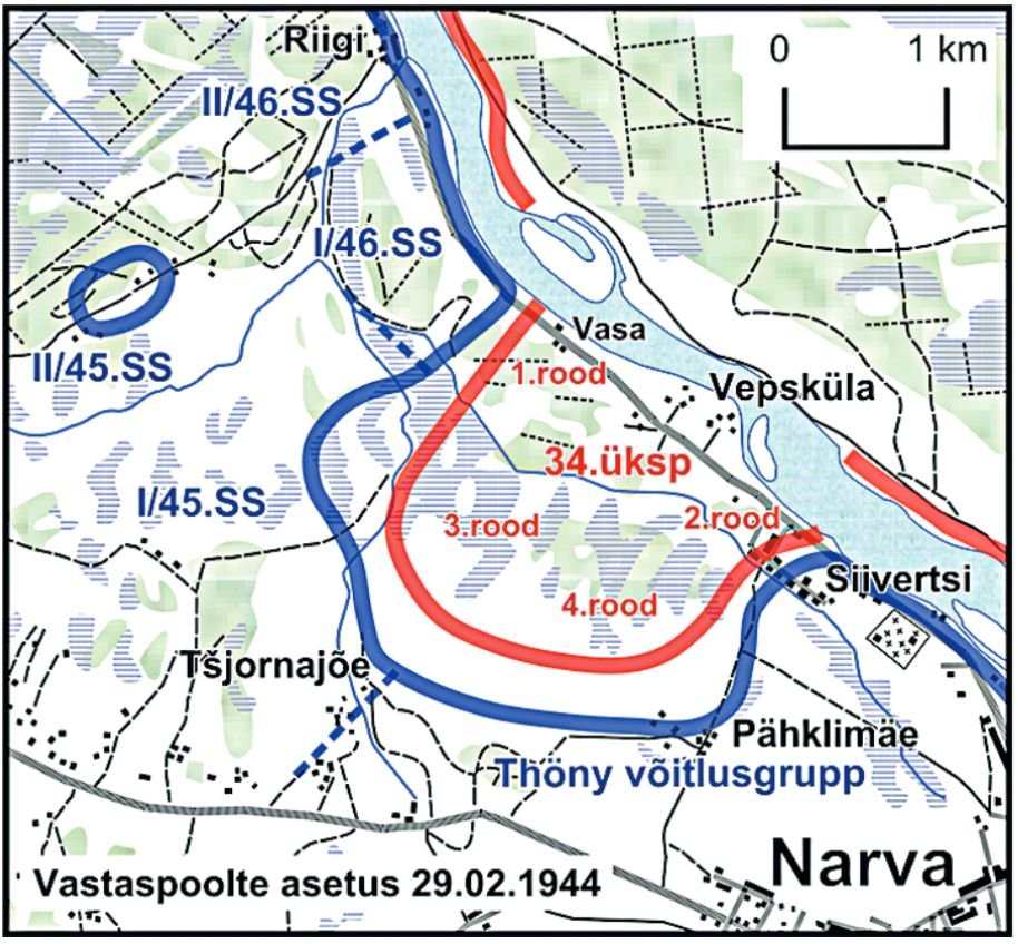 Eks see 1,5 x 1,5 km on natuke umbkaudne (mõni diagonaal tuleks vist veidi pikem, mõni veidi lühem), aga su postituses oleval kaardil on sillapea siiski päris kindlalt ebatäpselt märgitud kui räägime ajavahemikust 29.02-06.03.44. Sillapea võis ajutiselt (korraks) selline olla kuskil 12.02.44. Venelased tungisid 12.02 Narva suunas välja kalmistuni (aga ainult korraks), hõivasid Vasa talu ja siis laiendasid päeva jooksul sillapead sisemaa suunas (tunduvalt rohkem kui su kaardil märgitud).