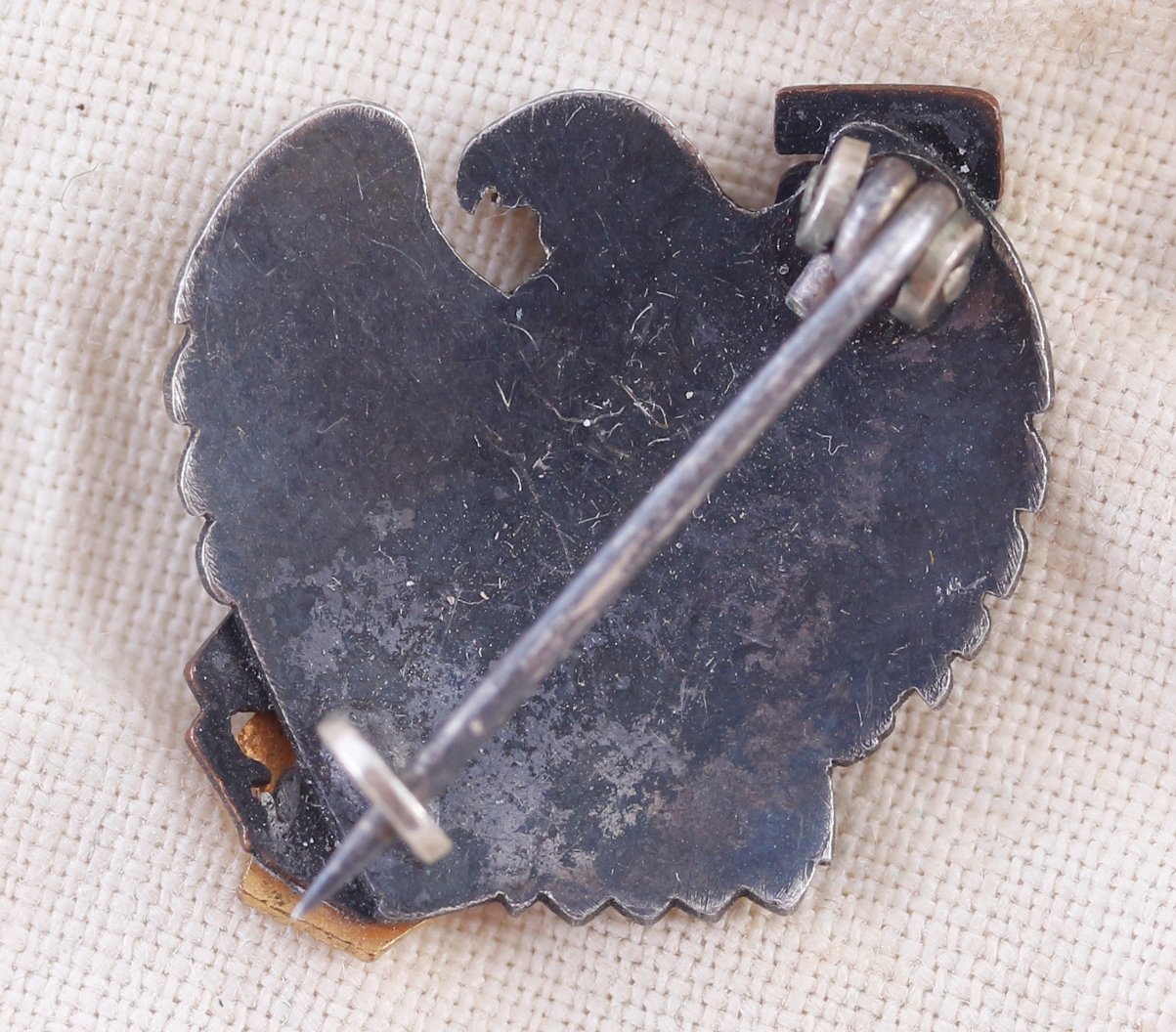 Kena märk aga esmamulje järgi ütleks, et see ei ole meie meistrite käekiri ja töö. Sellist tüüpi nõelkinnitus ei ole ka EW märkidele väga iseloomulik, kus nõel on kinnitatud tihvtiga märgi külge kinnitatud pesasse. Ega kinnituskonksule ei ole mingeid proovimärke löödud? Kui peaks arvama siis pakuksin, et hoopis Soome märk.