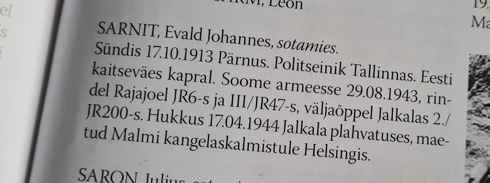 See Leinarist on annetatud 1944. aasta 17. aprillil Soomes Jalkala plahvatuses surma saanud Evald Sarnitile. Leinaristid anti üle langenud sõduri sugulastele. Ma ei ole Soome autasudega üldse kursis ja tahaks teada, et kuidas selle VR'i statuut ette nägi - kas annetati postuumselt kõigile langenutele?