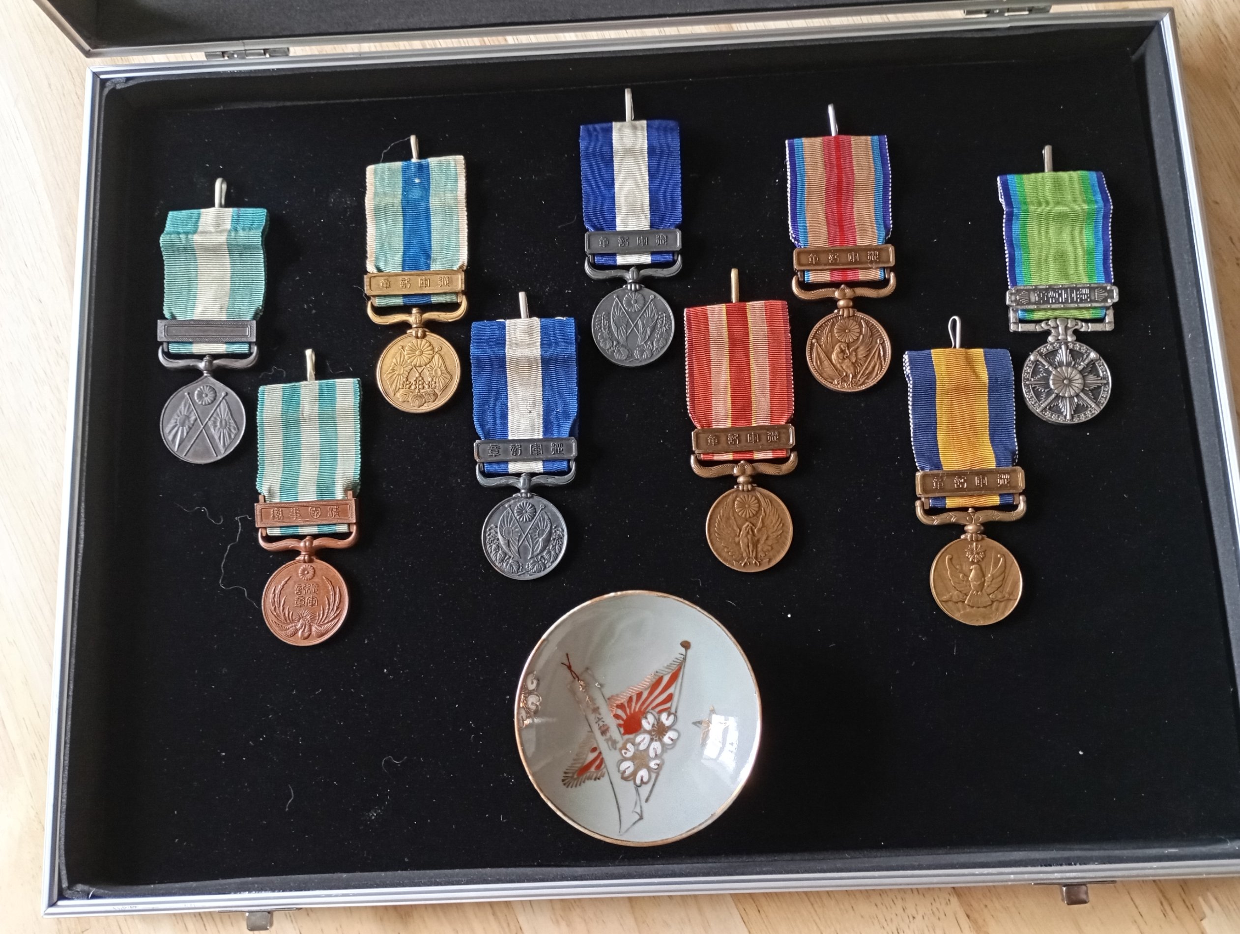 Vitriin nr 7 - tervikkogu kus on kronoloogilises järjekorras kõik imperaatorliku Jaapani sõjaliste kampaaniate 9 x medalit // pole raske mõista, et moodsa ajastu Jaapan disainis oma sõjamedalid Suurbritannia eeskujul.. medalite rida algab 1894-95 Hiina-Jaapani sõja medaliga (vasakult esimene) ja lõpeb 1941-45 Suure IdaAasia sõja medaliga (paremalt viimane).. all on väike sõjaväe saketassike mida katab Imperaatorliku maaväe sümboolika