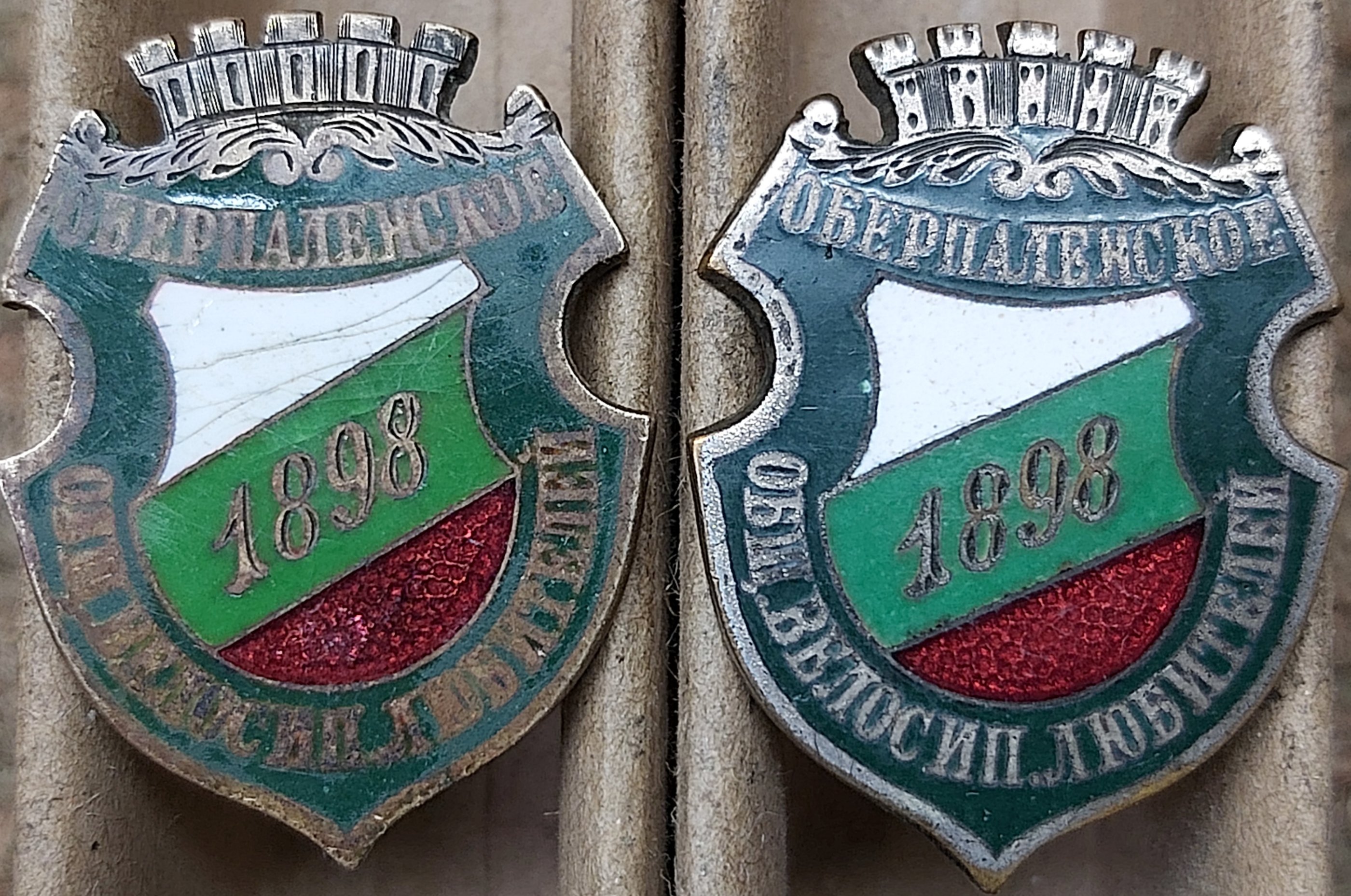Oberpahleni Jalgrattaseltsi liikmemärgid - kuldne ja hõbedane. Kroonide kujunduses väike erinevus.