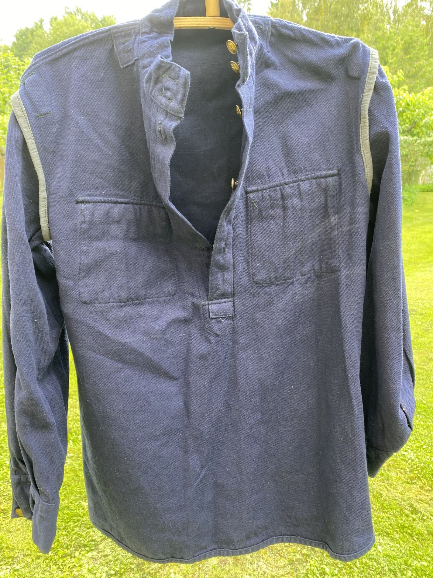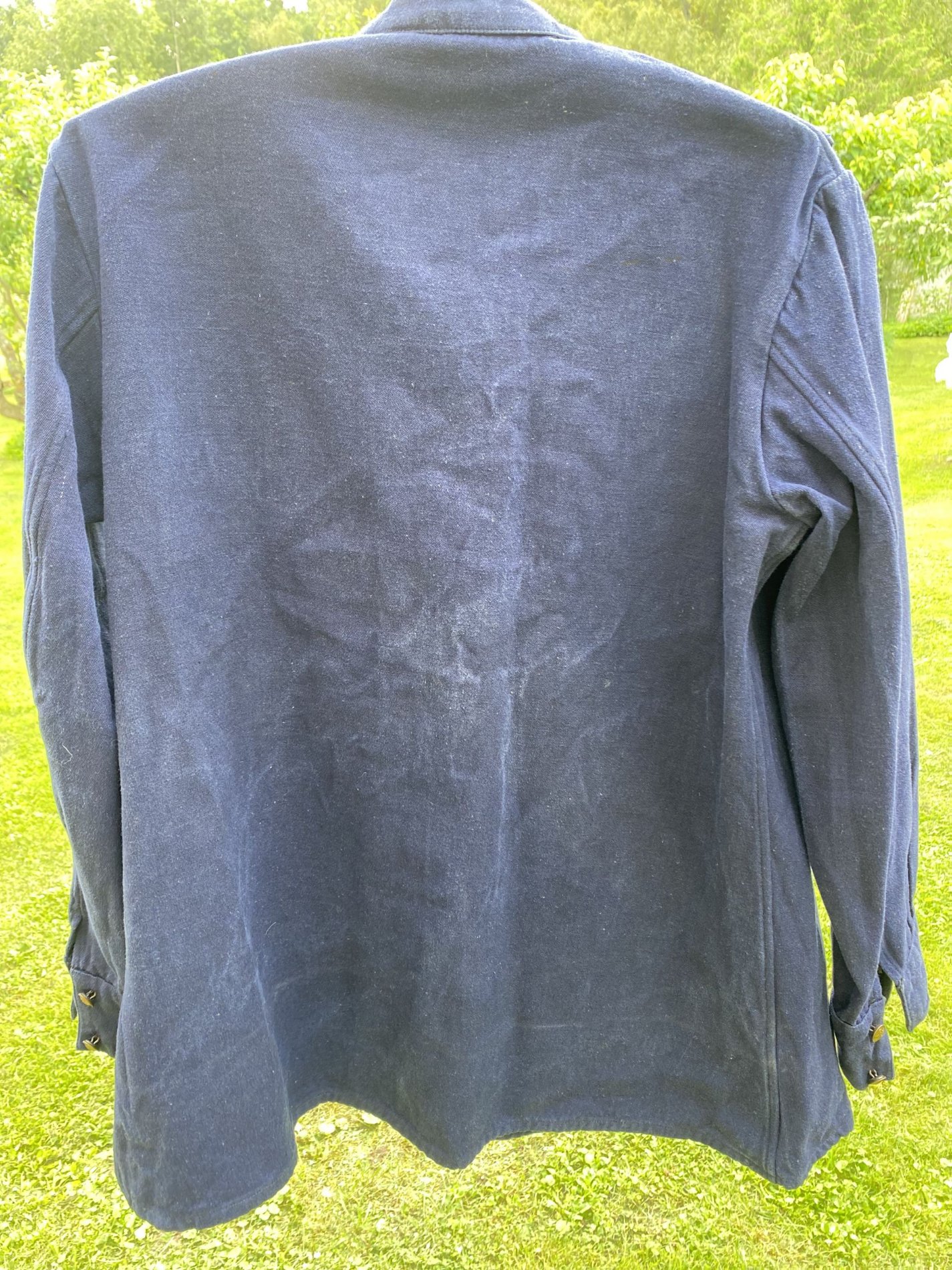 Värvus sinine, nööbid aastast 1953, mingid templid ka sees, nii varrukatel kui seljal. Netist väga infot ei leidnud, et võrrelda. Kas tegu õige asjaga, kes kandsid ja mis aasta mudel võiks olla. Nööbid ei anna alati õiget ajastut kui toode laos (NZ) kaua seisnud.