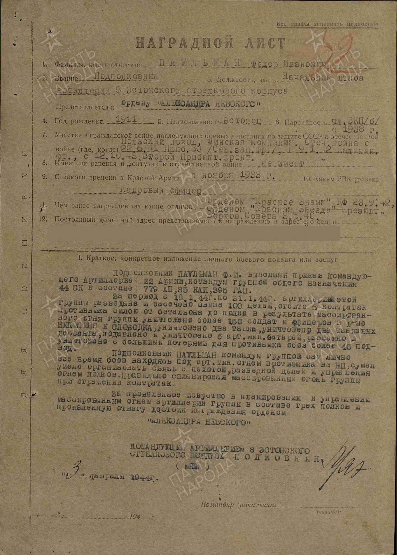 major Elmar Paulman (7. laskurdiviisi 23. suurtükiväepolk, 04.02.1944)