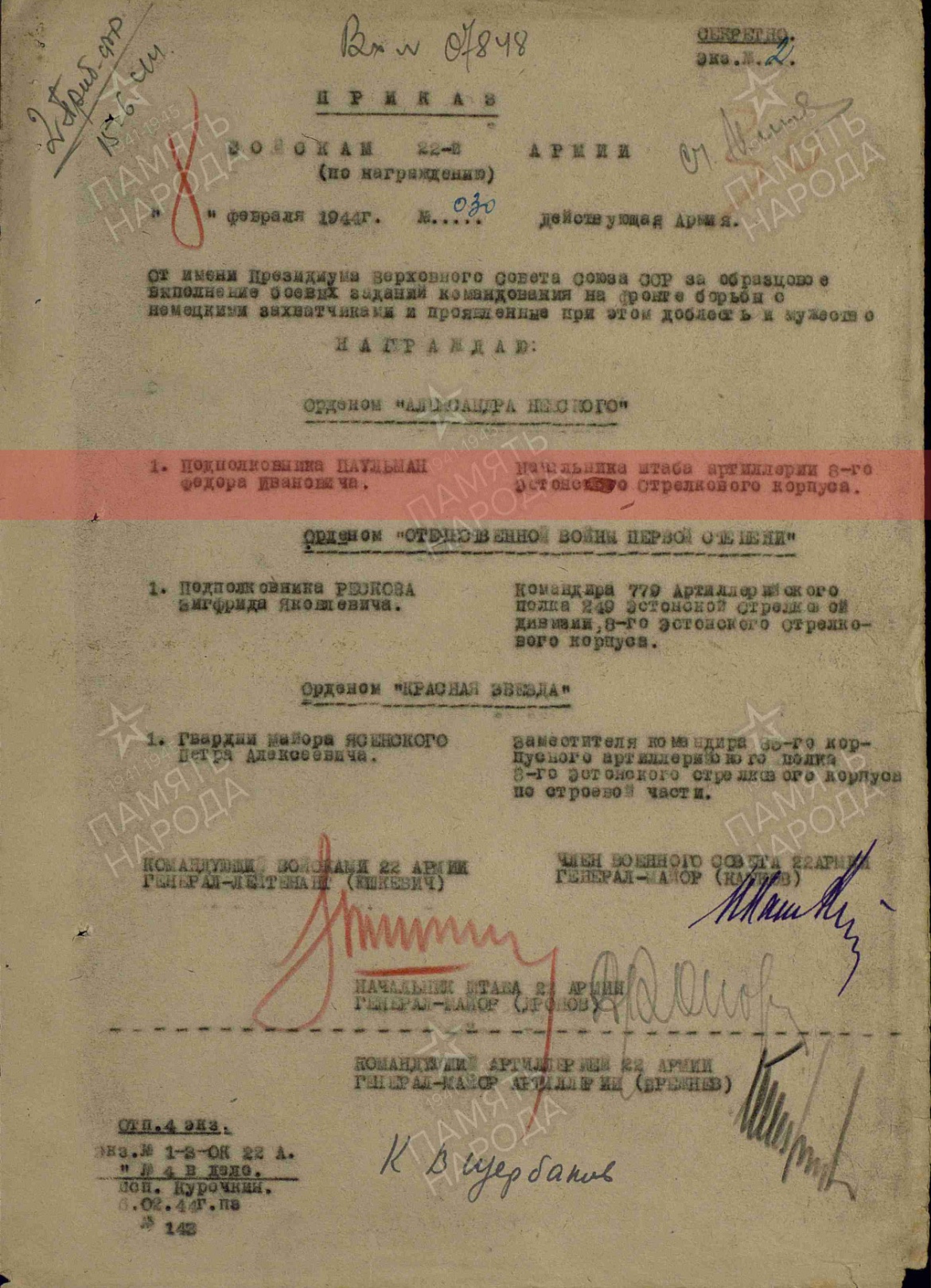 Ajaleht "Harju Elu", 23.02.1946 - täpselt üles loetletud arvud 7. laskurdiviisi autasudest ja tuleb välja, et diviisi peale kokku annetati 22 Aleksander Nevski ordenit.