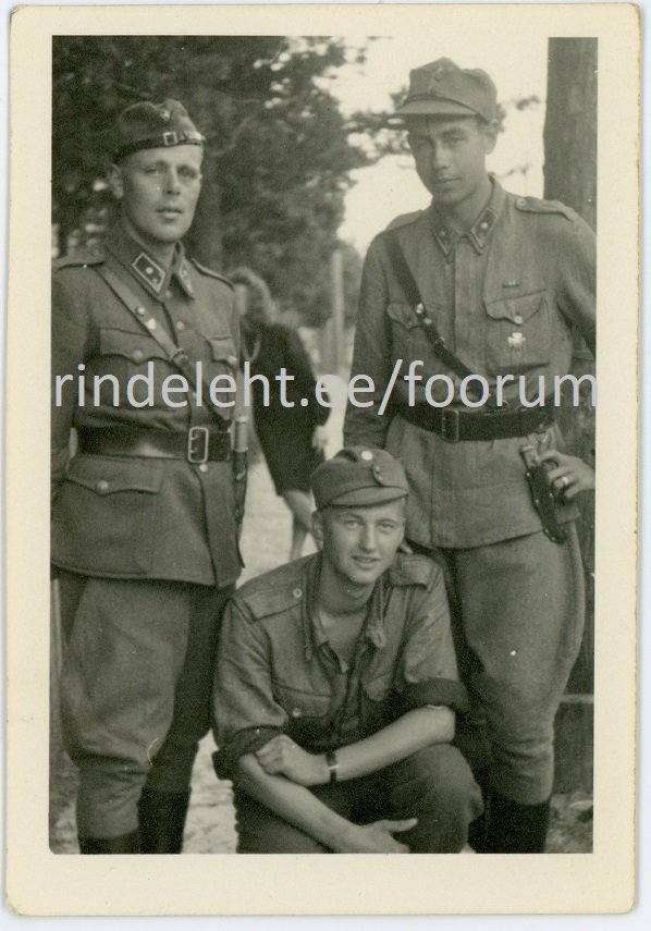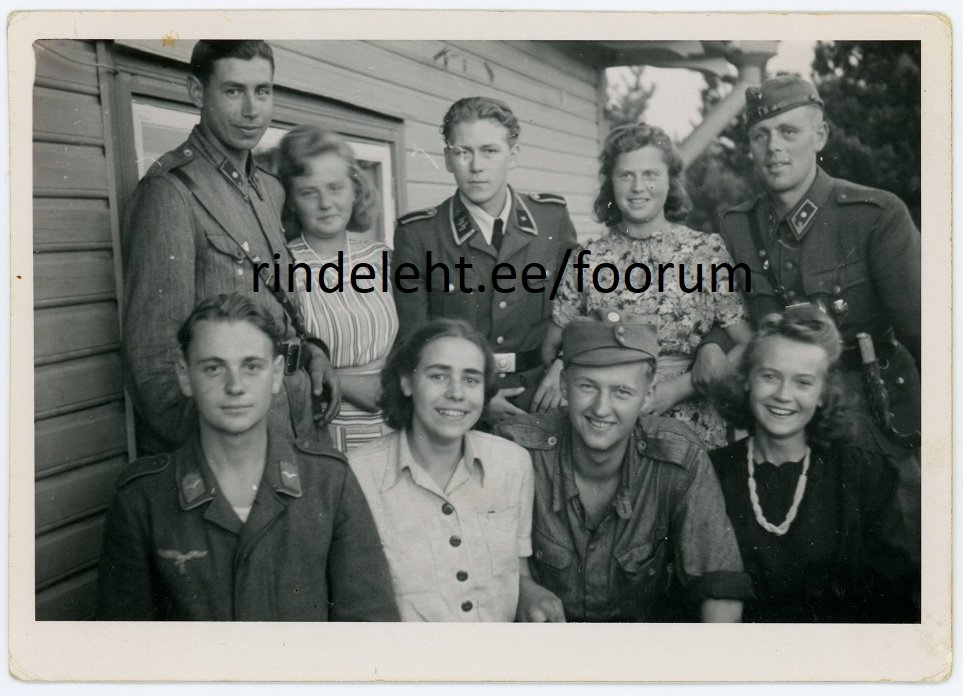 Sõbrad erinevates vormides. Püsti: vasakult lipnik Arendi, Aino, tundmatu eestlasest ss-unterscharführer (võibolla Ilmar Lindpere?, Voldemari vend), lipnik Voldemar Lindpere. Ees: luftwaffe vormis Ülo Putmaker (kuulsa korvpalluri Arvo Putmakeri vend; isa oli kolonel Eduard Putmaker), Arendi õde ja reamees Klasen.
