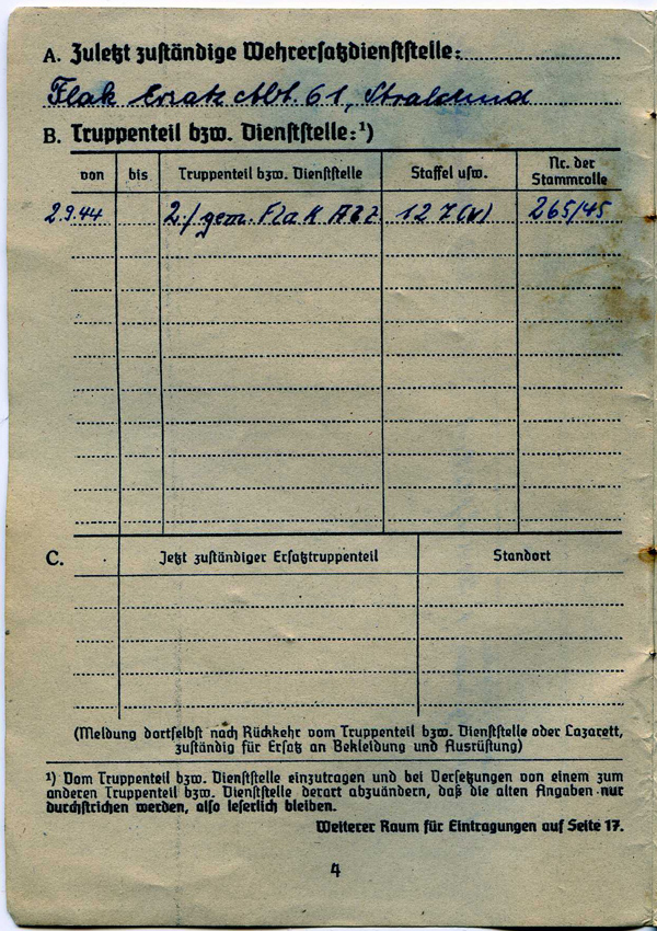 soldbuch'i tagumise kaane vahel on lisaleht, kuhu on märgitud õppelaskmiste tulemused - nagu näha tehti õppelaskmisi veel 24.4.1945