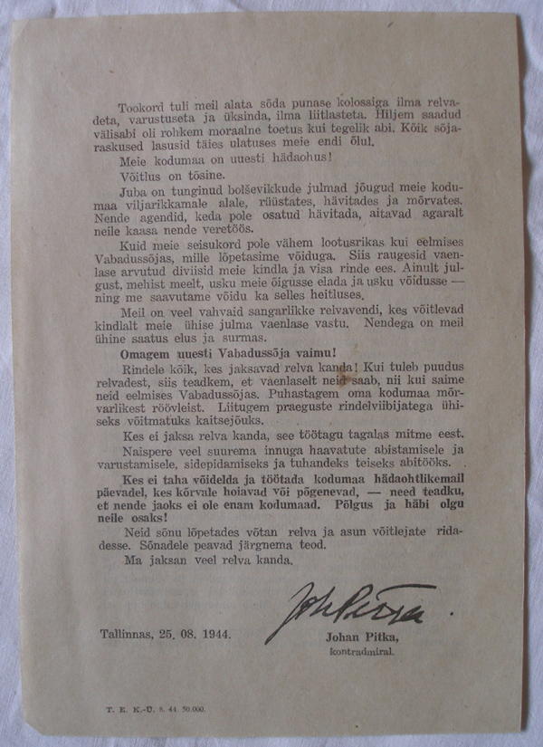 See üleskutse on mu meelest üks igavesti vahva paber :lol: See näitab, et Sakslased pidasid ametlikult ja avalikult kinni ka sõjaõigusest ja seega on alusetu süüdistada, et ei peetud sõjaõigusest kinni (nagu Genfi konvensioon vms). Täideti sel ajal kehtivaid õigusi ja öeldi seda ka avalikult :lol: