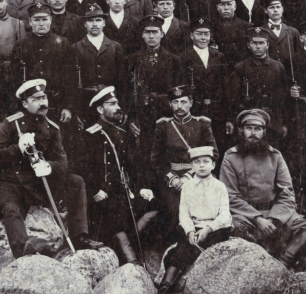 võitlejad kannavad nn "ополченскiй крестъ" ehk siis tegemist on reservväelastest (II järgu?) koosnenud irregulaarse maakaitseüksusega. Härrad ohvitserid kannavad, vist jah, Aleksandr III aegset vormi. Täpsemat infot saab vene foorumitest www.ww2.ru/forum või www.sammler.ru - seal on nihukesed asjatundjad, et ütlevad paugu pealt, kust polgust, mis auastmes ja mis ajal pildistatud.