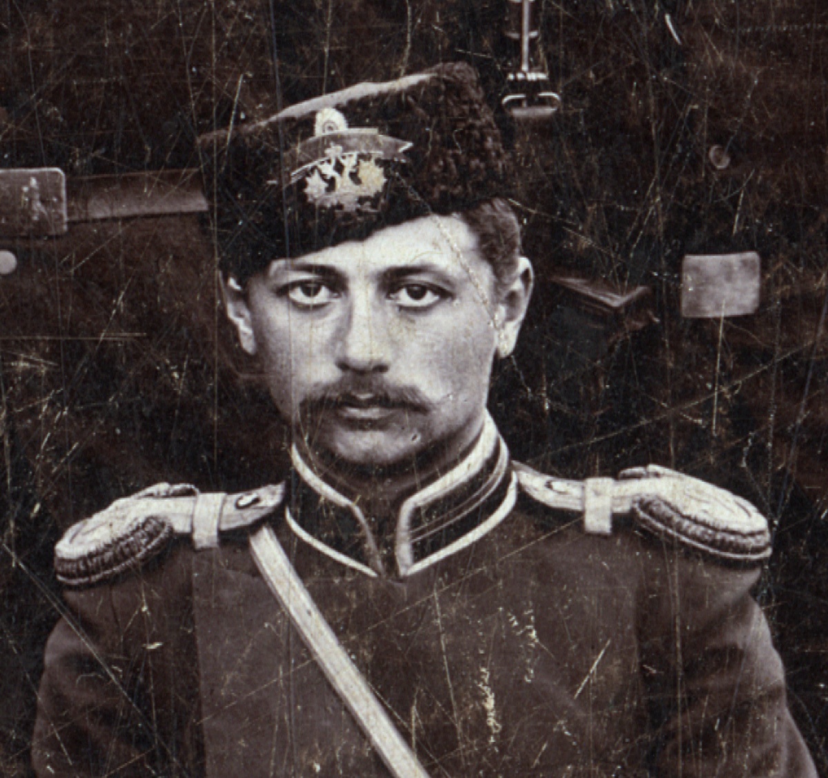 Epolettidega härrasmees kannab Aleksander III aegset jalaväeohvitseri vormi. Seega on 1914. aasta rindeleminek natuke kahtlane...