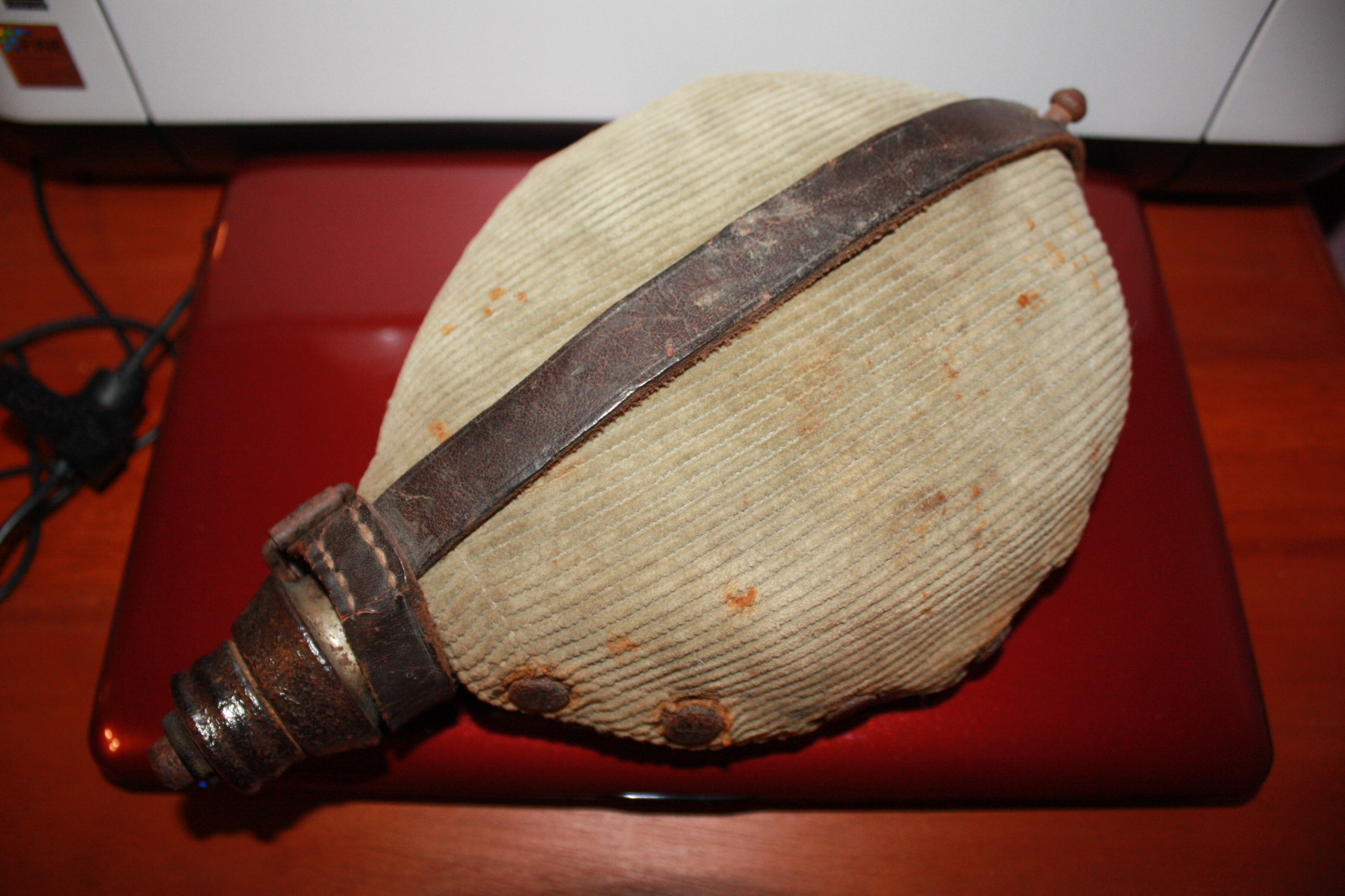 Esimese Ilmasõja aegne Saksa M1915 välipudel, tinaga kaetud terasest. See isend pärit Saaremaalt. Vilt ja rihm terved, samuti kork. Puudu väike rihmajupp, mis korki muu kupatusega ühendab, trukid roostes, pudel vett ei pea.