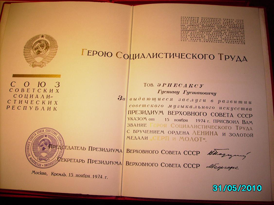 2010 ei olnudki kõige halvem aasta. Erilist heameelt tunnen muidugi E. Puusepa punatähe üle ja muuhulgas sattus ka minule mõningaid Ernesaksa autasusid. Tuli aga ka näiteks ühe teise kuulsa mehe pabereid, millest pildid allpool. 2010 jõudis minuni ka eestlasele ( kahjuks mitte G.Ots ) antud NSVL Rahvakunstniku rinnamärk koos tunnistusega, mis on paras leid, sest vist ca. 20 eestlast ongi seda aunimetust üleüldse saanud.