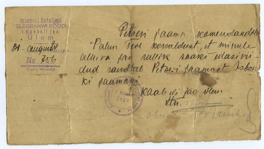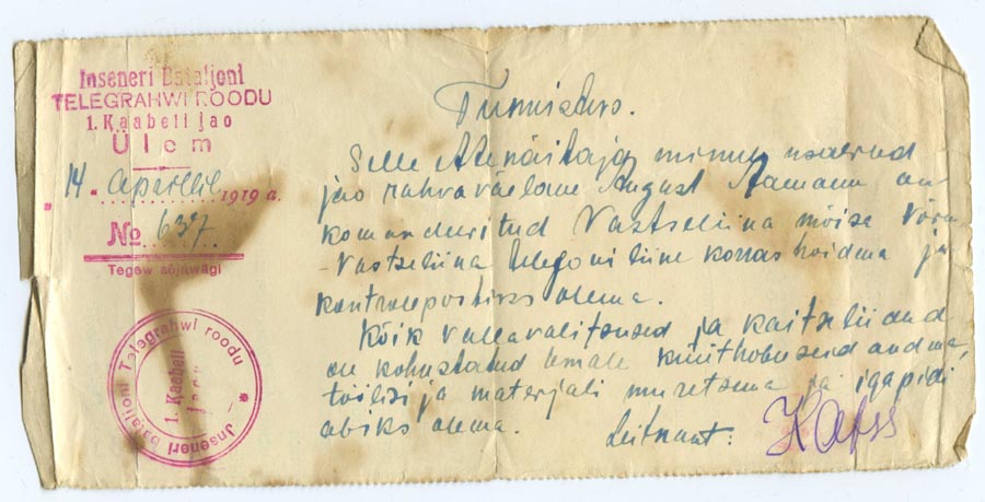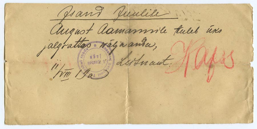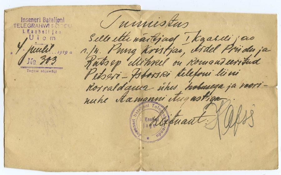 Vabadussõja lõpus August Aamann'ile väljastatud tunnistus, mis tõestab, et ta on lõpetanud kolmekuulised elektrotehnika kursused.