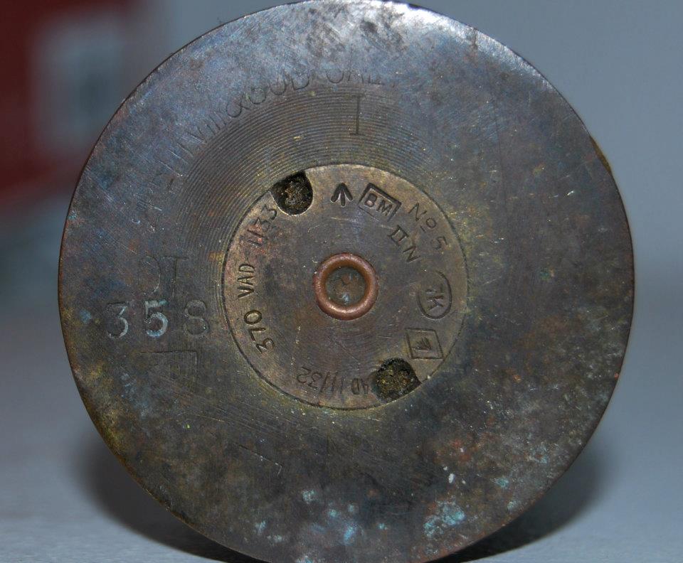 Kahjuks pole võimalik praegu väga täpseid mõõte öelda korraliku mõõtevahendi puudumisel kuid silmajärgi tundub olema silinder ja suudmes u. 40 mm Kirjad peal nii peened, et olin sunnitud tegema macro foto aru saamaks mis seal üldse kirjutatud. Pikkus taas u. 154mm Selle LOT kohta raske öelda kuid võimalik.uudishimulik kirjutas:Kui hülss täispikkuses, siis pane mõõdud (pikkus, suudme läbimõõt ja tagumise otsa läbimõõt). Siis tuvastamine peaks kerge olema?