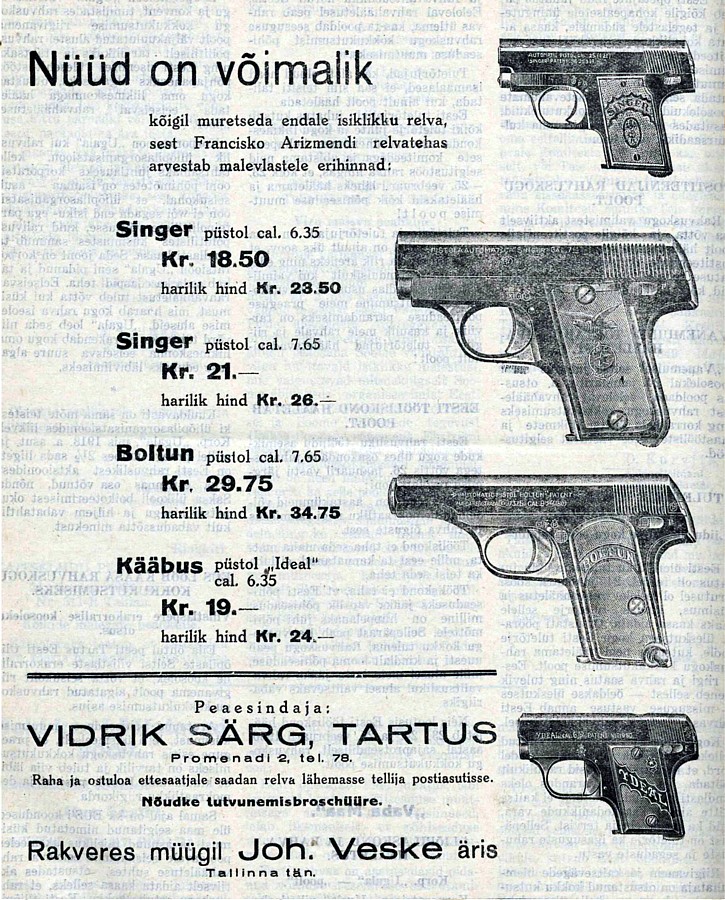 Franscesco Arizmendi "Singer" cal 6,35 pakuti müügiks ka kaitseliitlastele, hinnaga 18.50 Kr.
