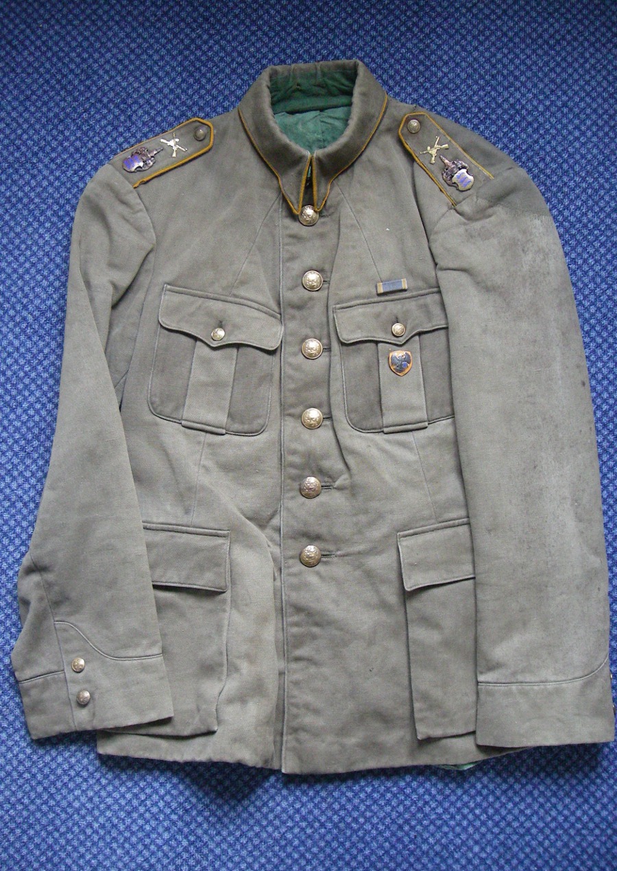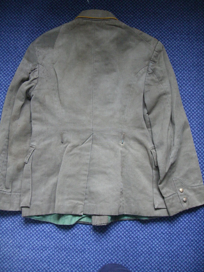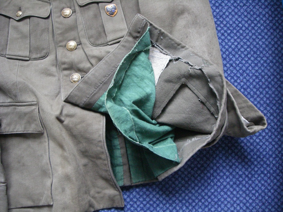 Kuue vasak õlg parandatudmaterjaliga mis on alumiste taskute seest võetud. Parem alumine tasku seest uuesti ära parandatud. Algselt on ka pagunitel olnud Saare maleva märgid.