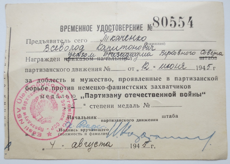 Ja siin siis lõpuks ka üks viiekümne nelja hulgast, kes said ENSV-s II klassi partisanimedali. Eriti huvitavaks teeb dokumendi asjaolu, et tegemist on ajutise tunnistusega. Lõviosa partisane sai oma medali kätte 1945. aastal ja tegelikult vist ongi nii, et autasustatud isikud said koos medaliga alguses ajutise tunnistuse, mille pidid hiljem ringi vahetama. Sest kui erinevaid punaste kaantega partisanimedalite dokumente vaadata, siis on sinna sisse kirjutatud kõige varasemaks aastaks mille leidsin - 1947. Punaste kaantega dokumendid ise trükiti küll Moskvas 1945. aastal, kuid ei pruukinud sugugi autasustamise ajaks siia jõuda.