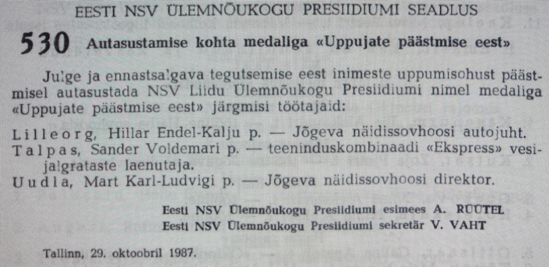 1987. aasta autasustamine on sisse kantud hilisemasse dokumenti, millel enam seerianumbrit ei ole. 1987. aastal autasustati ‘’Uppuja päästmise eest ‘’ medaliga kokku 11 korda.
