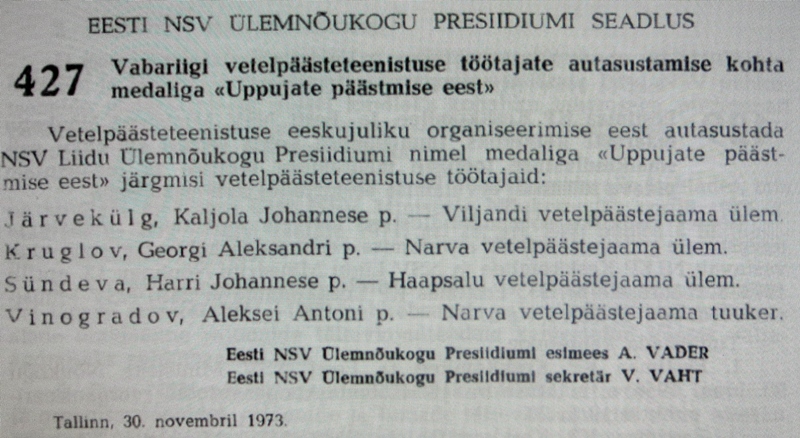 Üks Uppuja päästmise eest veel lisaks. 1966. aastal autasustati medaliga 19 korda.